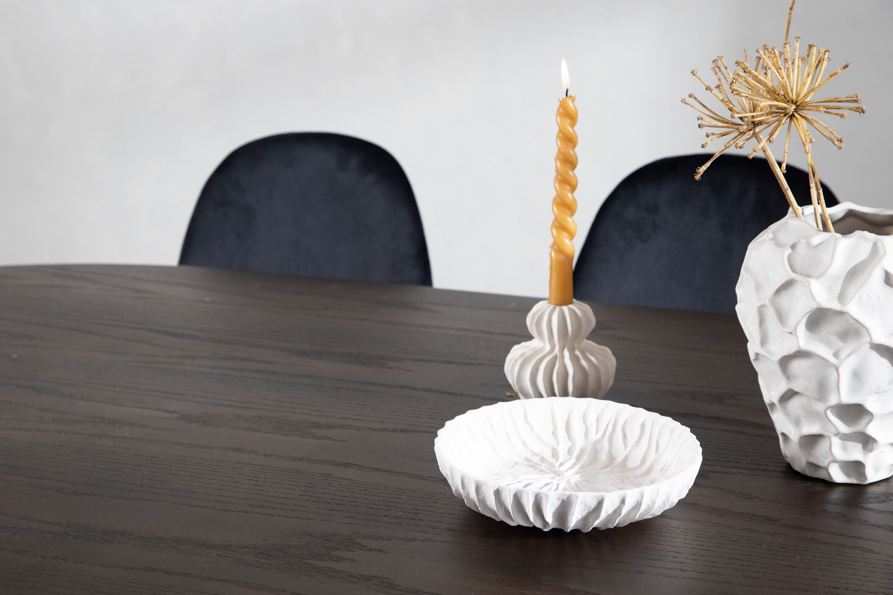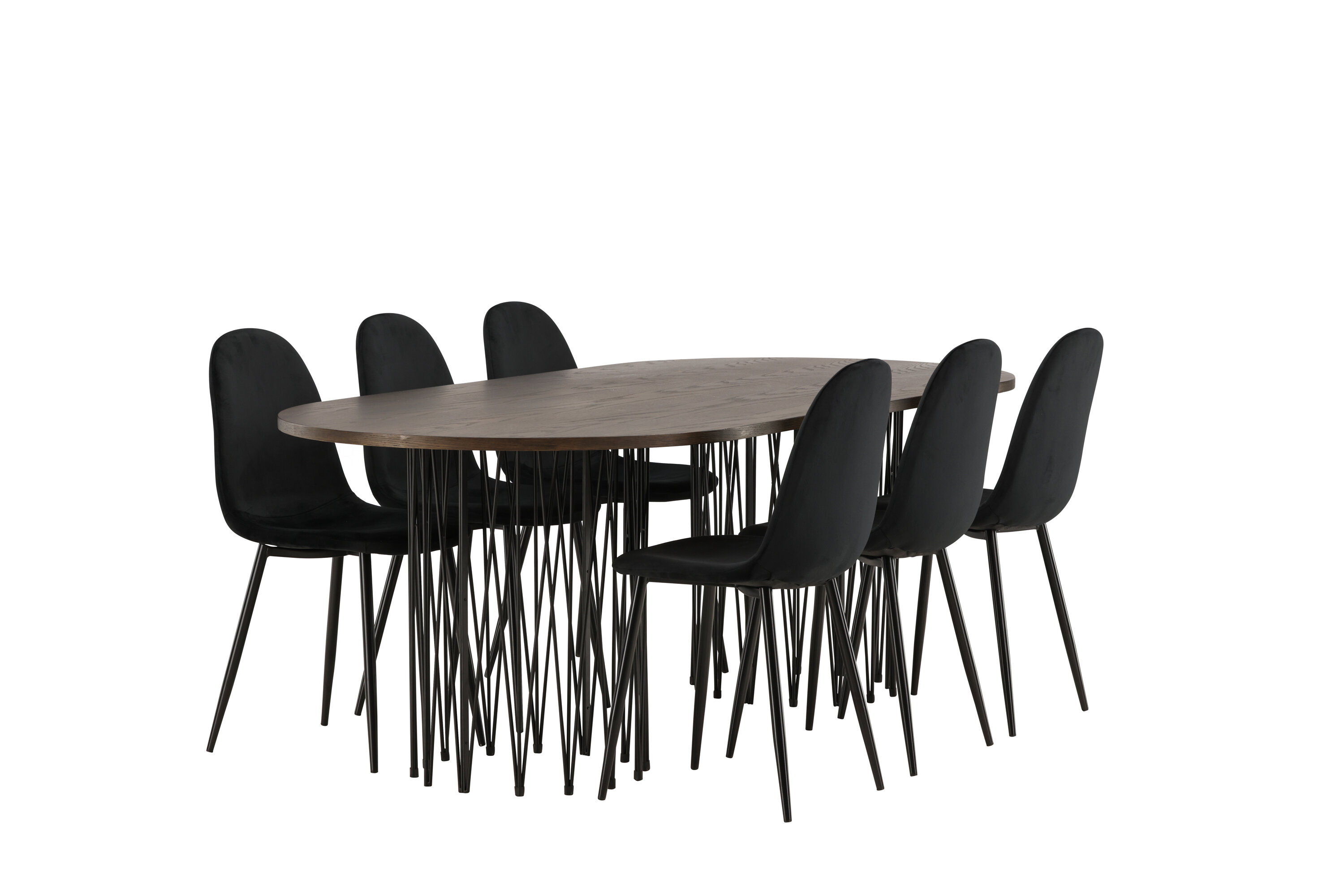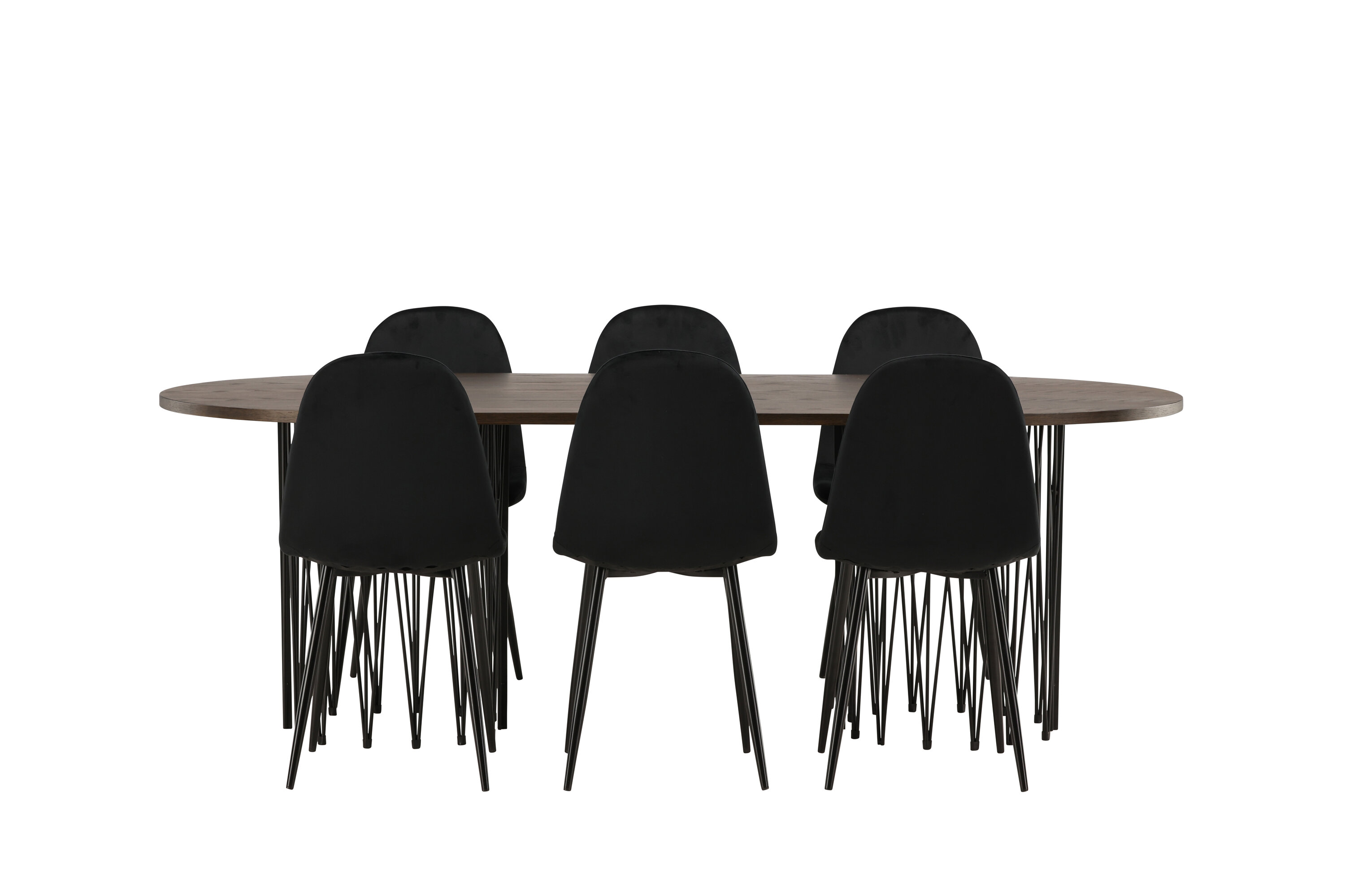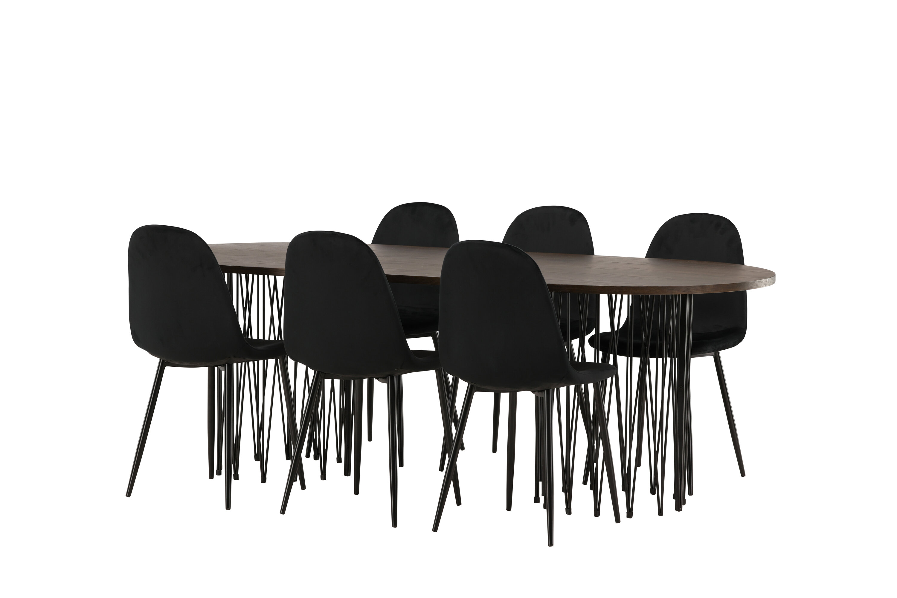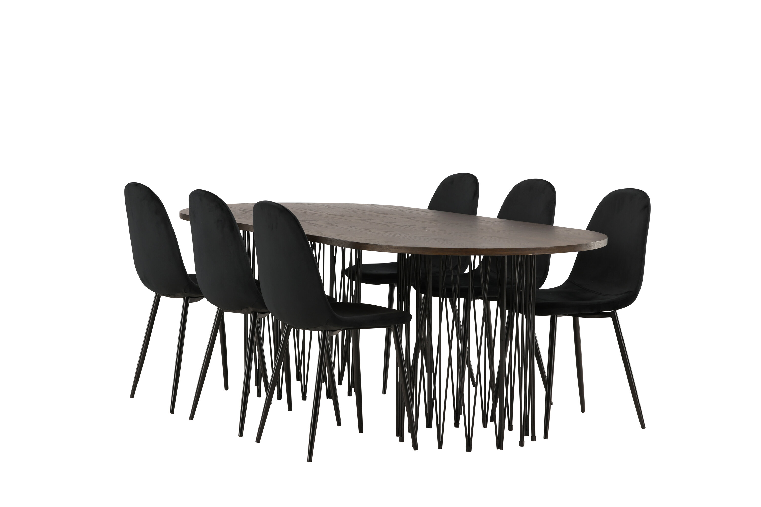 Een bijpassende eetgroep die snel een uitnodigende en moderne sfeer creëert! De Stone eettafel maakt indruk met zijn modebewuste design. Het behoort tot de Furniture Fashion collectie en heeft een prachtig bruin gekleurd tafelblad in MDF met fineer en twee decoratieve cilindervormige lijsten in zwart metaal. Hier samen met comfortabele stoelen uit de Polar serie. De stoel heeft een volledig gestoffeerd ontwerp met een afgeronde rugleuning en zitting in zwart fluwelen stof met zachte vulling en poten in zwart gepoedercoat metaal. Voorkom compromissen tussen comfort en design!