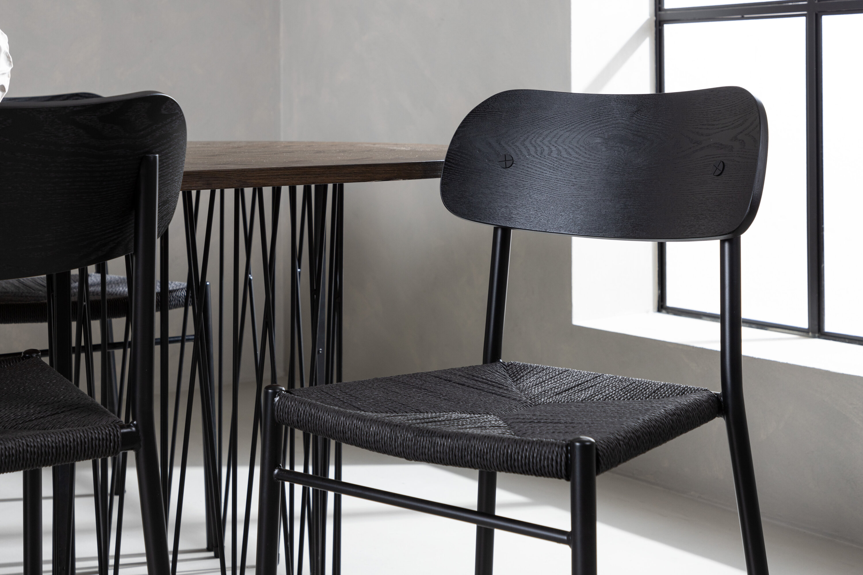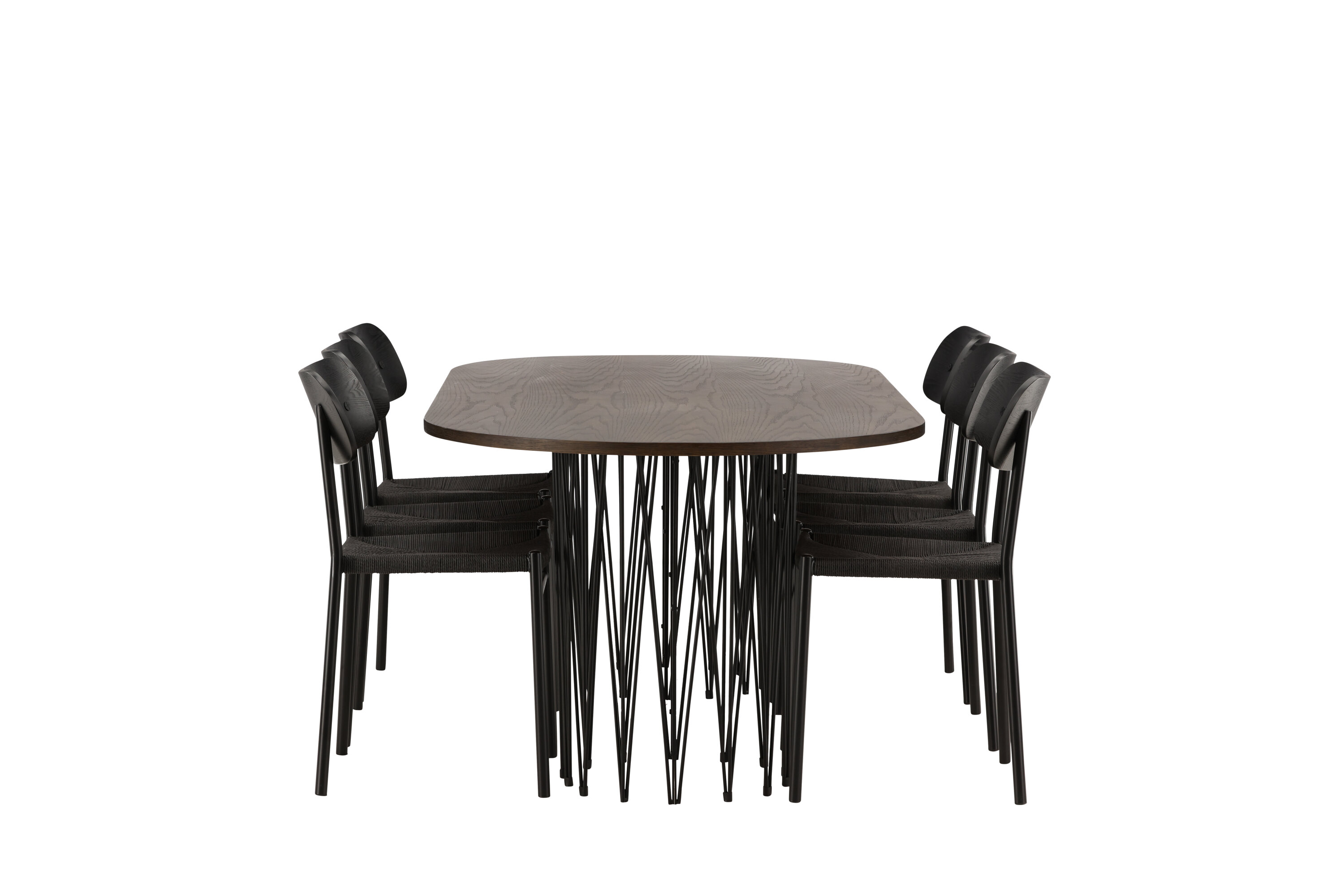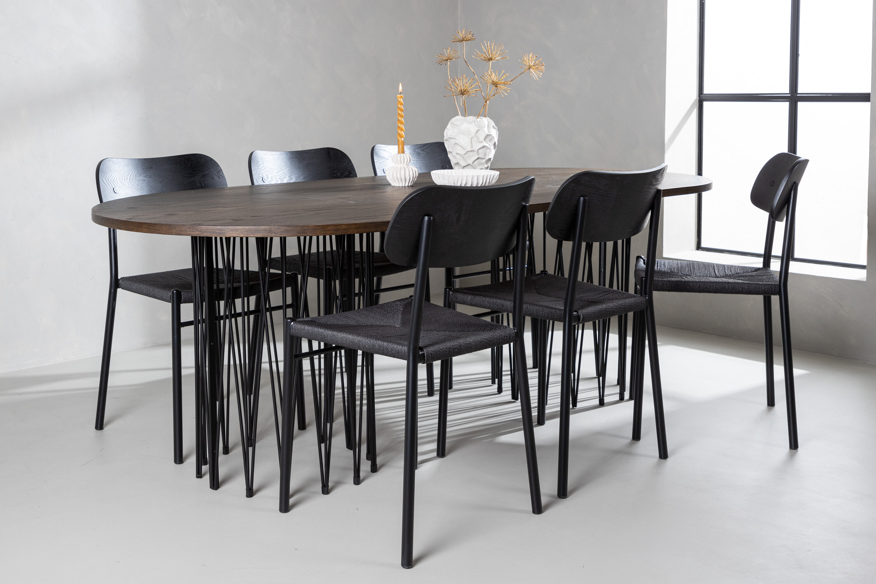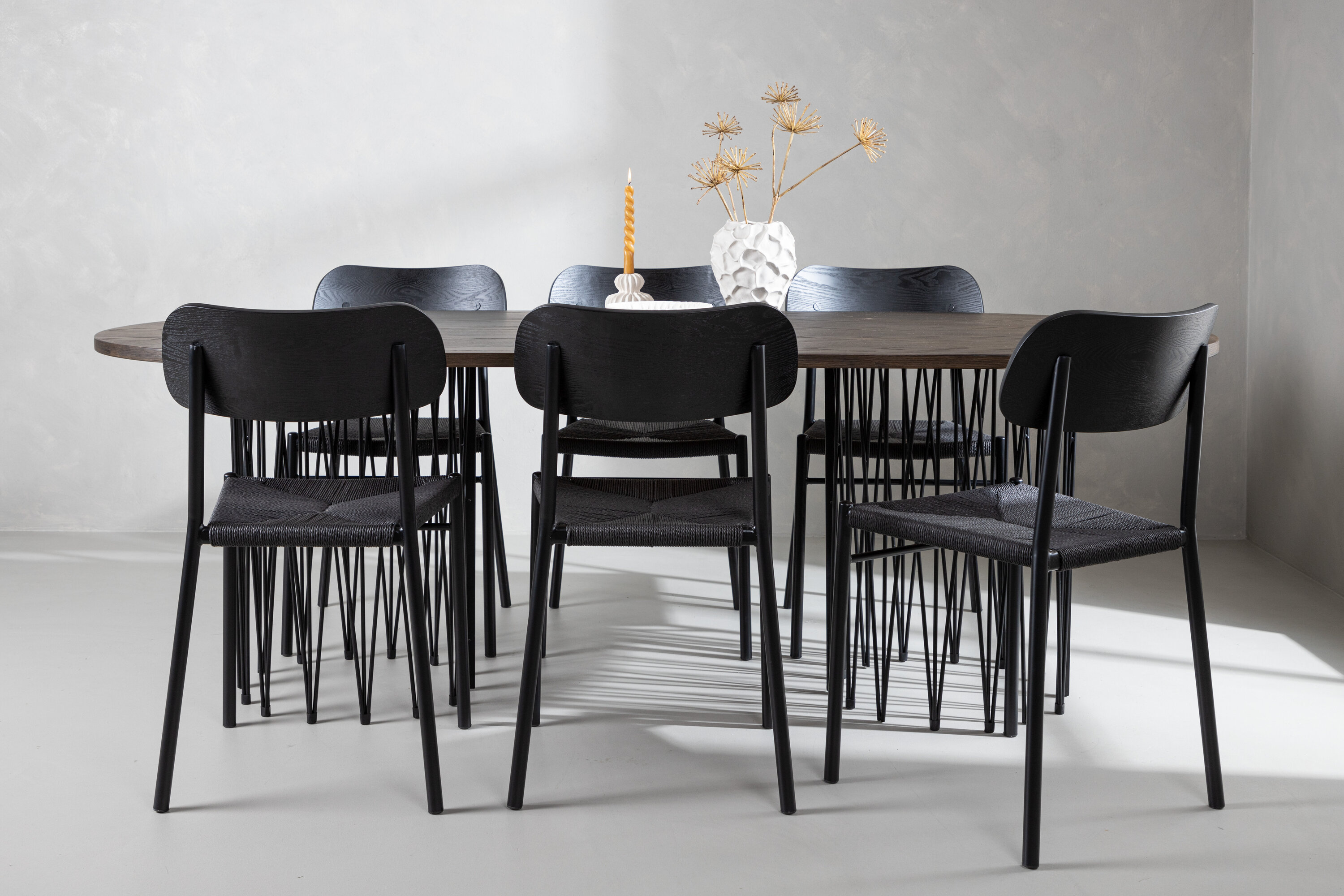 Modern, stijlvol en duurzaam - de Stone eettafel maakt indruk met zijn modebewuste ontwerp. Het behoort tot de Furniture Fashion collectie en heeft een prachtig bruin gekleurd tafelblad in MDF met fineer en twee decoratieve cilindervormige lijsten in zwart metaal. Hier in perfecte combinatie met onze populaire eetkamerstoelen Polly. De rugleuning van de stoel is in zwart MDF met fineer, de zitting in trendy zwarte natuurvezel stof en de poten zijn in zwart gepoedercoat metaal. Zit comfortabel en trendbestendig in de toekomst!