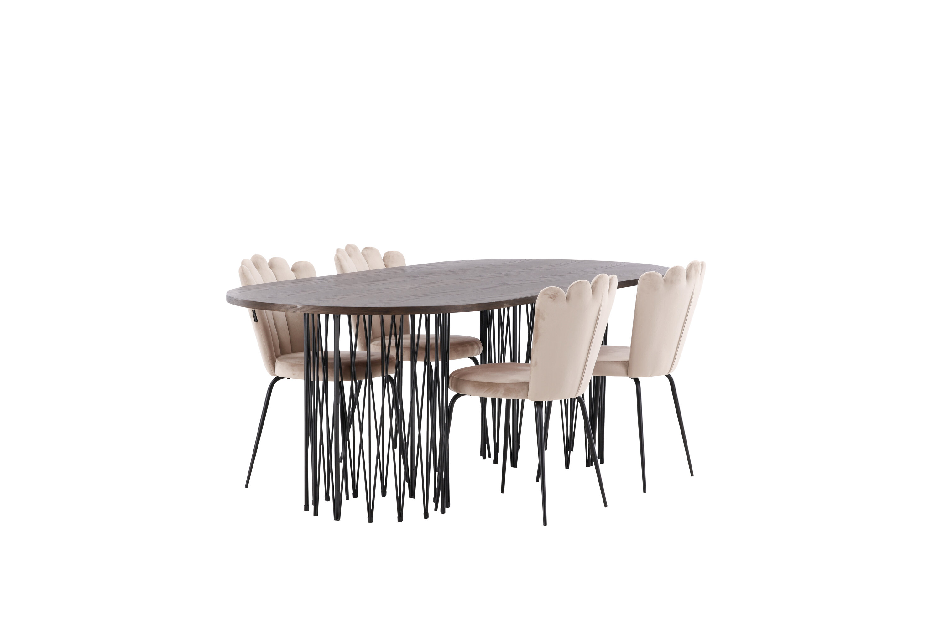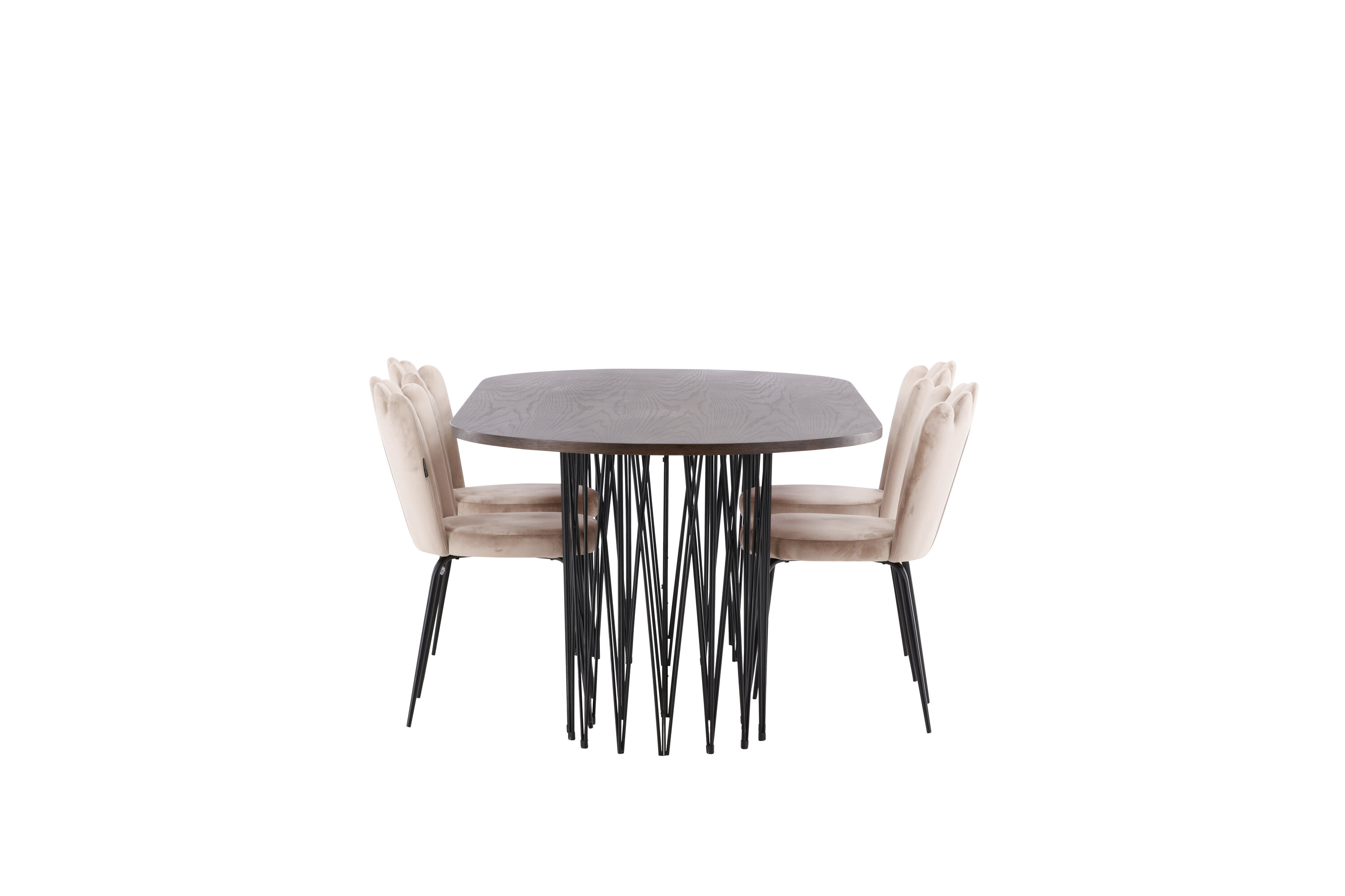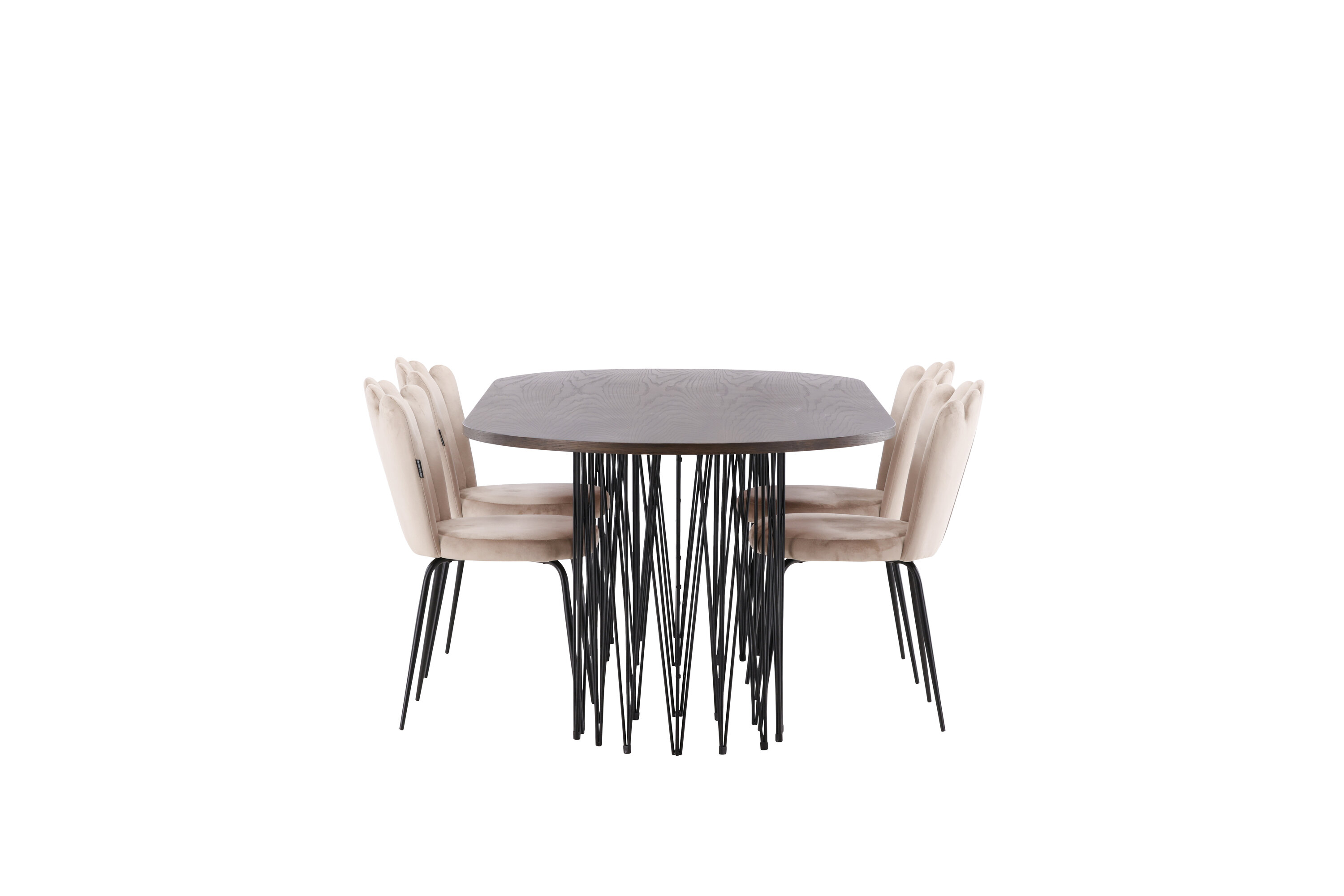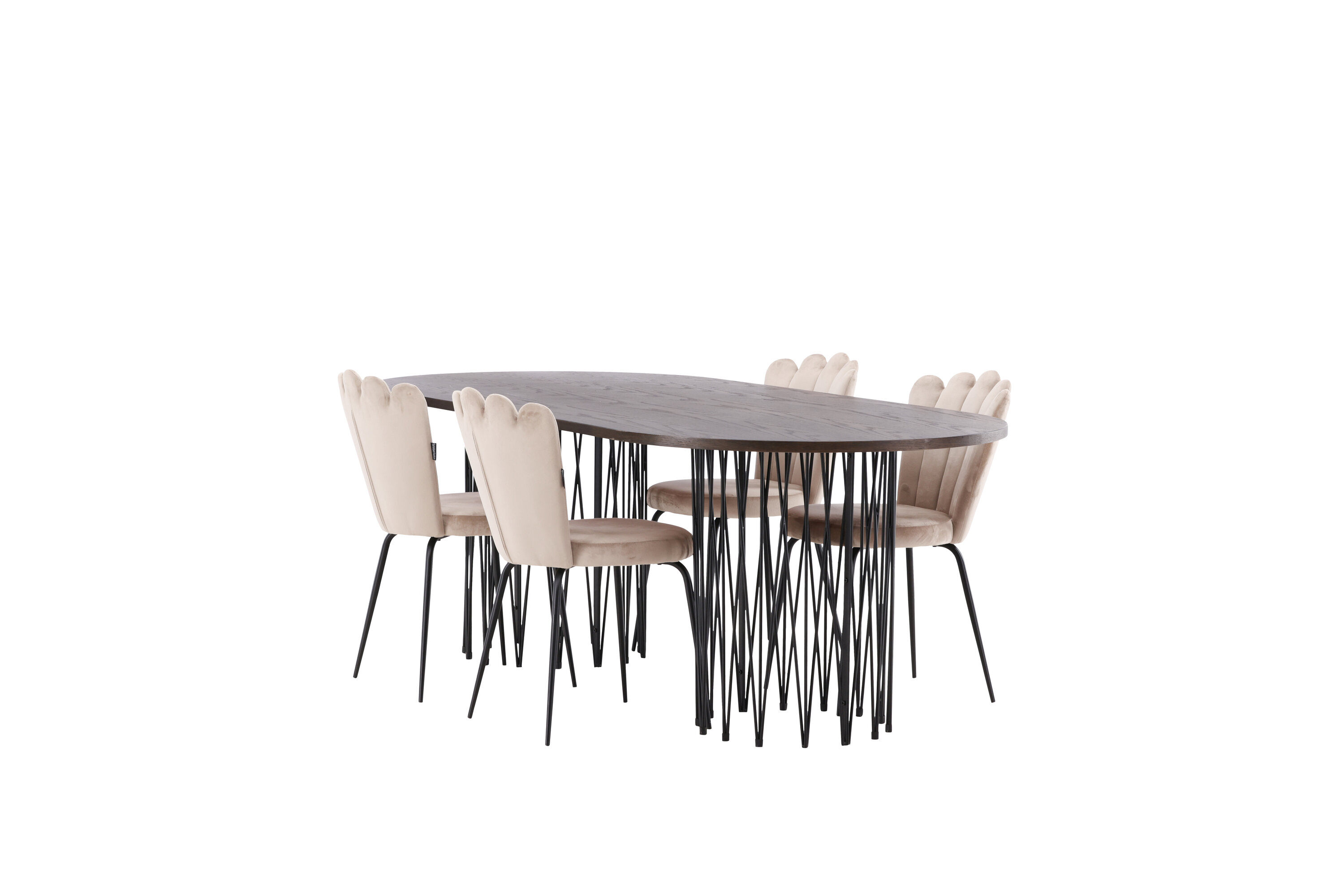 Richt het hart van je huis in met een eetgroep die luxe en comfort uitstraalt! Onze ovale eettafel Stone heeft een fantastisch Scandinavisch design dat past bij de menigte. De tafel heeft een prachtig bruin gekleurd tafelblad in MDF met fineer en twee decoratieve cilindervormige lijsten in zwart metaal. Hier in perfecte combinatie met onze heerlijke stoelen uit de Limhamn serie. De stoel is een moderne favoriet in veel huishoudens met zijn uitnodigende ontwerp, decoratieve schelpvormige rug met decoratieve stiksels en een ronde zitting in smaakvolle beige fluwelen stof. De poten zijn van zwart gepoedercoat metaal. Zit comfortabel en groots!