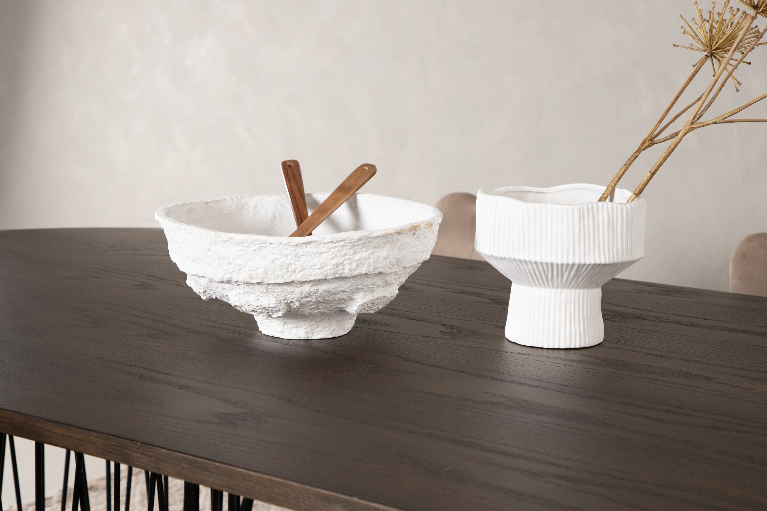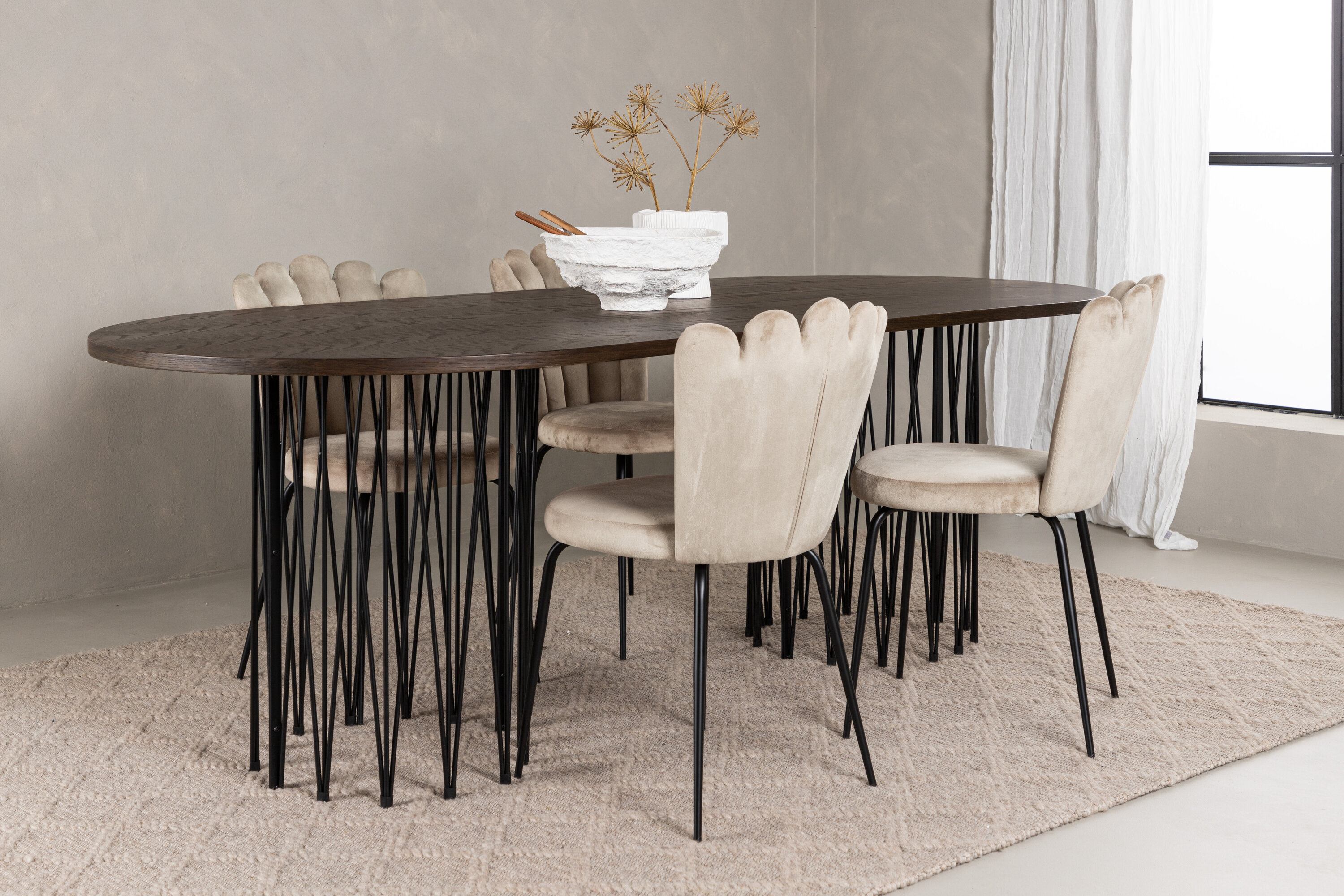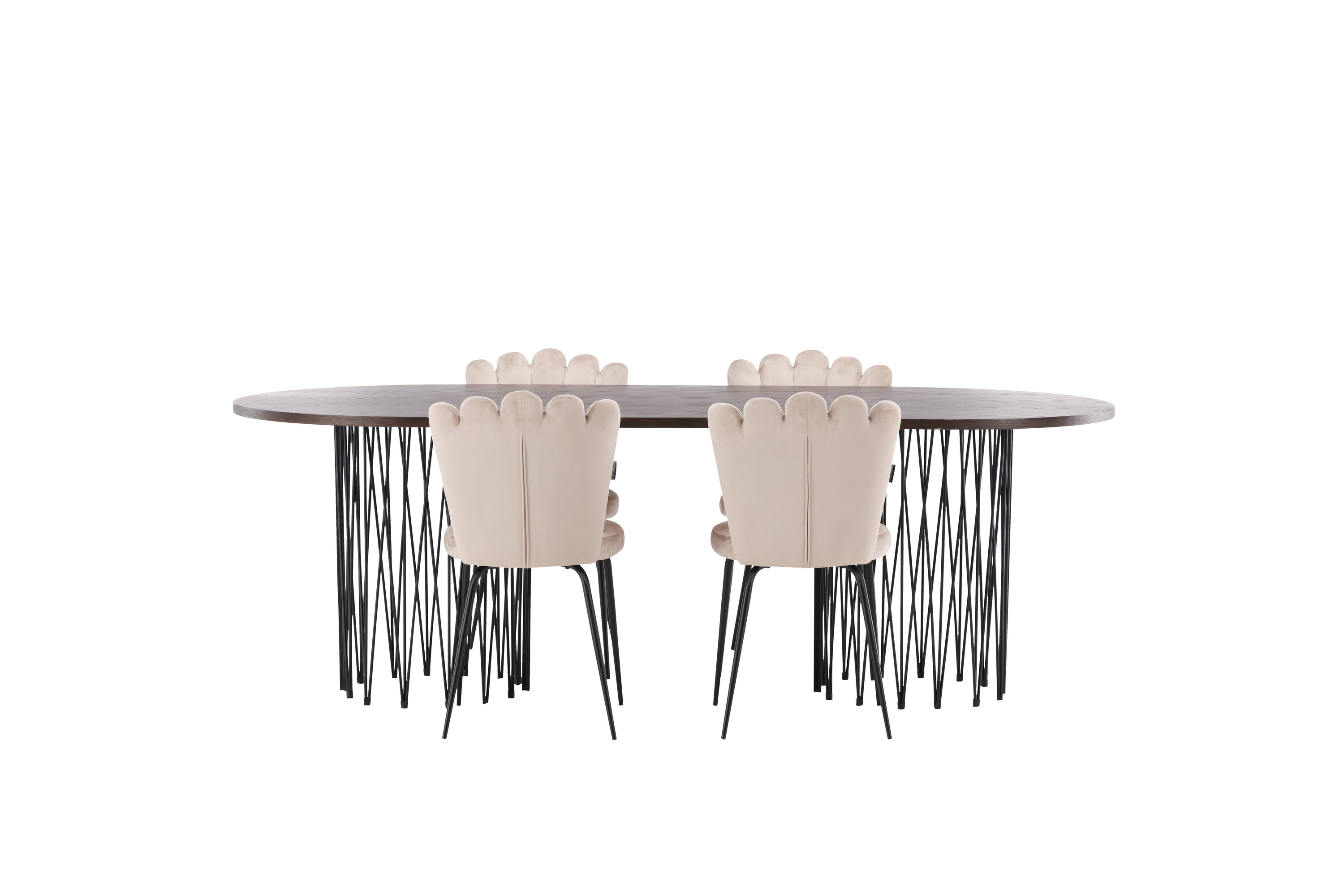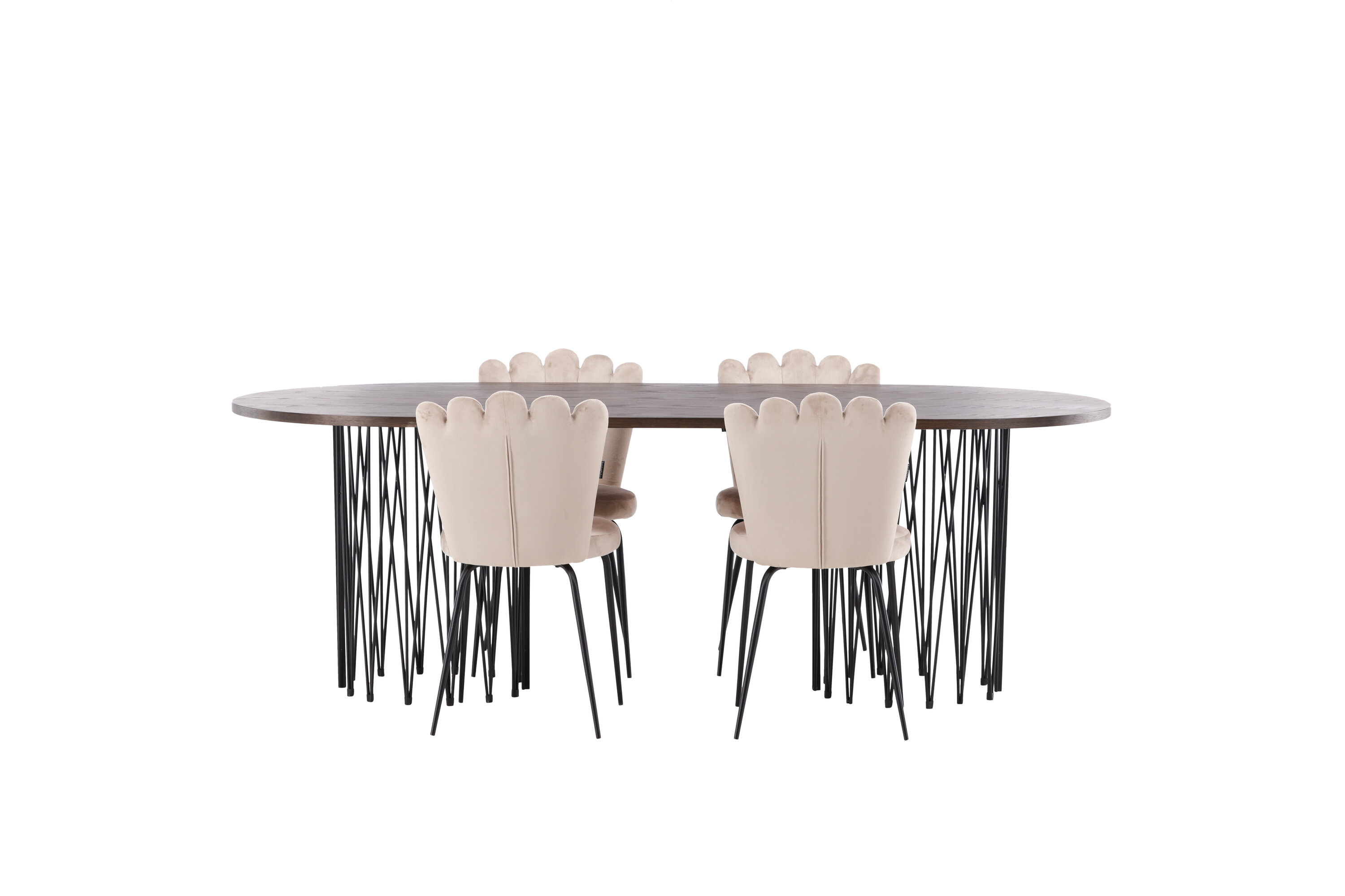 Richt het hart van je huis in met een eetgroep die luxe en comfort uitstraalt! Onze ovale eettafel Stone heeft een fantastisch Scandinavisch design dat past bij de menigte. De tafel heeft een prachtig bruin gekleurd tafelblad in MDF met fineer en twee decoratieve cilindervormige lijsten in zwart metaal. Hier in perfecte combinatie met onze heerlijke stoelen uit de Limhamn serie. De stoel is een moderne favoriet in veel huishoudens met zijn uitnodigende ontwerp, decoratieve schelpvormige rug met decoratieve stiksels en een ronde zitting in smaakvolle beige fluwelen stof. De poten zijn van zwart gepoedercoat metaal. Zit comfortabel en groots!