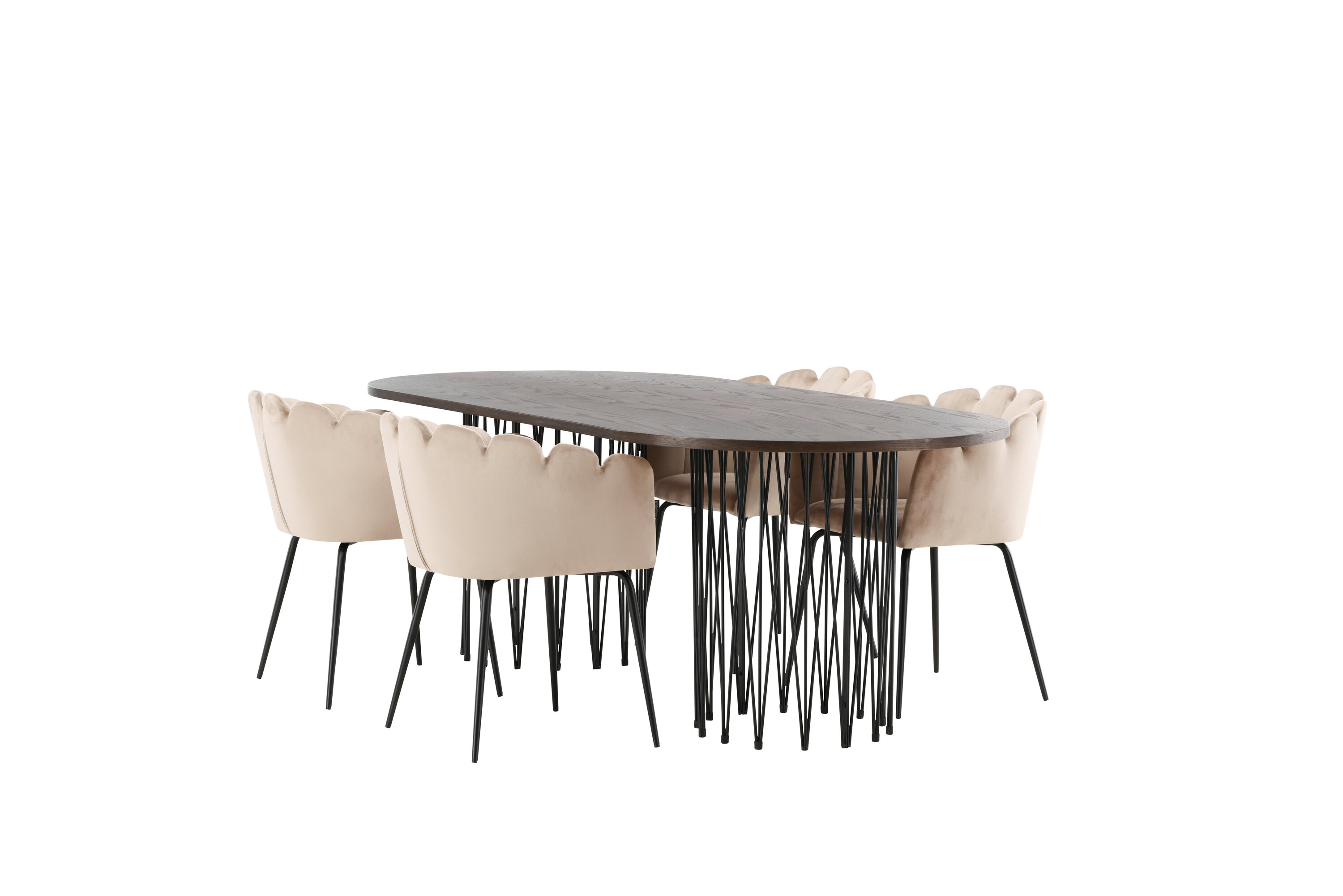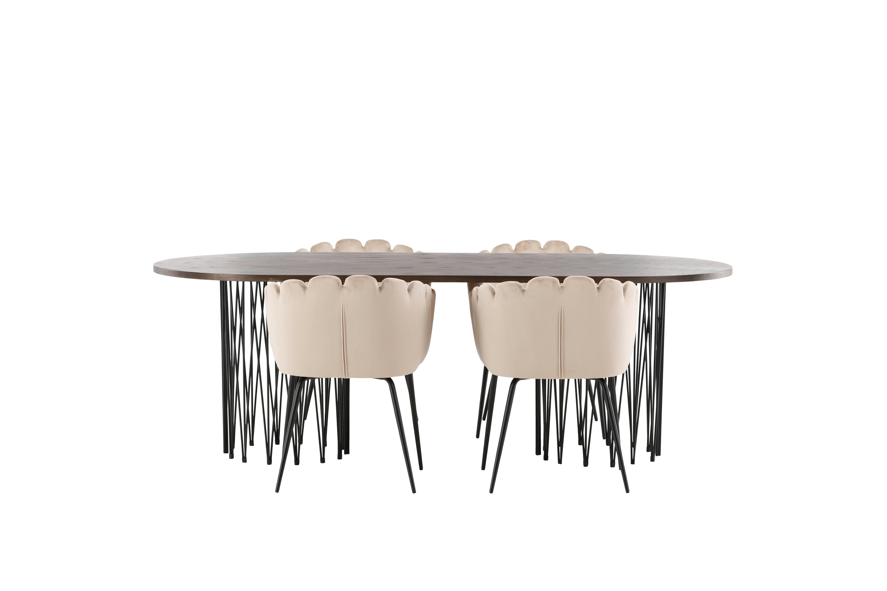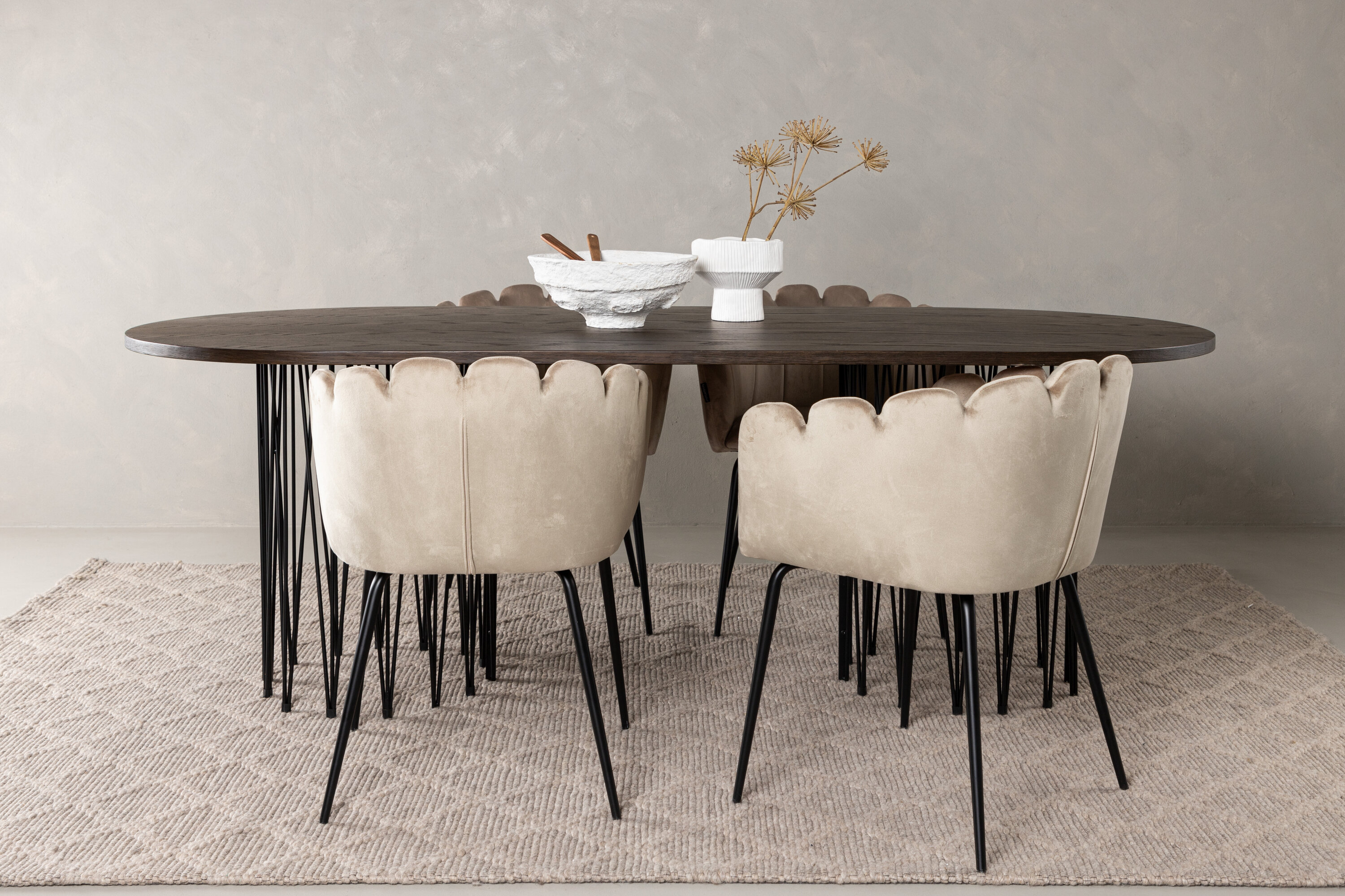 Richt het hart van je huis in met een eetgroep die luxe en comfort uitstraalt! Onze ovale eettafel Stone heeft een fantastisch Scandinavisch design dat past bij de menigte. De tafel heeft een prachtig bruin gekleurd tafelblad in MDF met fineer en twee decoratieve cilindervormige lijsten in zwart metaal. Hier in perfecte combinatie met onze heerlijke stoelen uit de Limhamn serie. De stoel is een moderne favoriet in veel huishoudens met zijn uitnodigende ontwerp, decoratieve schelpvormige rug met decoratieve stiksels en een ronde zitting in smaakvolle beige fluwelen stof. De poten zijn van zwart gepoedercoat metaal. Zit comfortabel en groots!