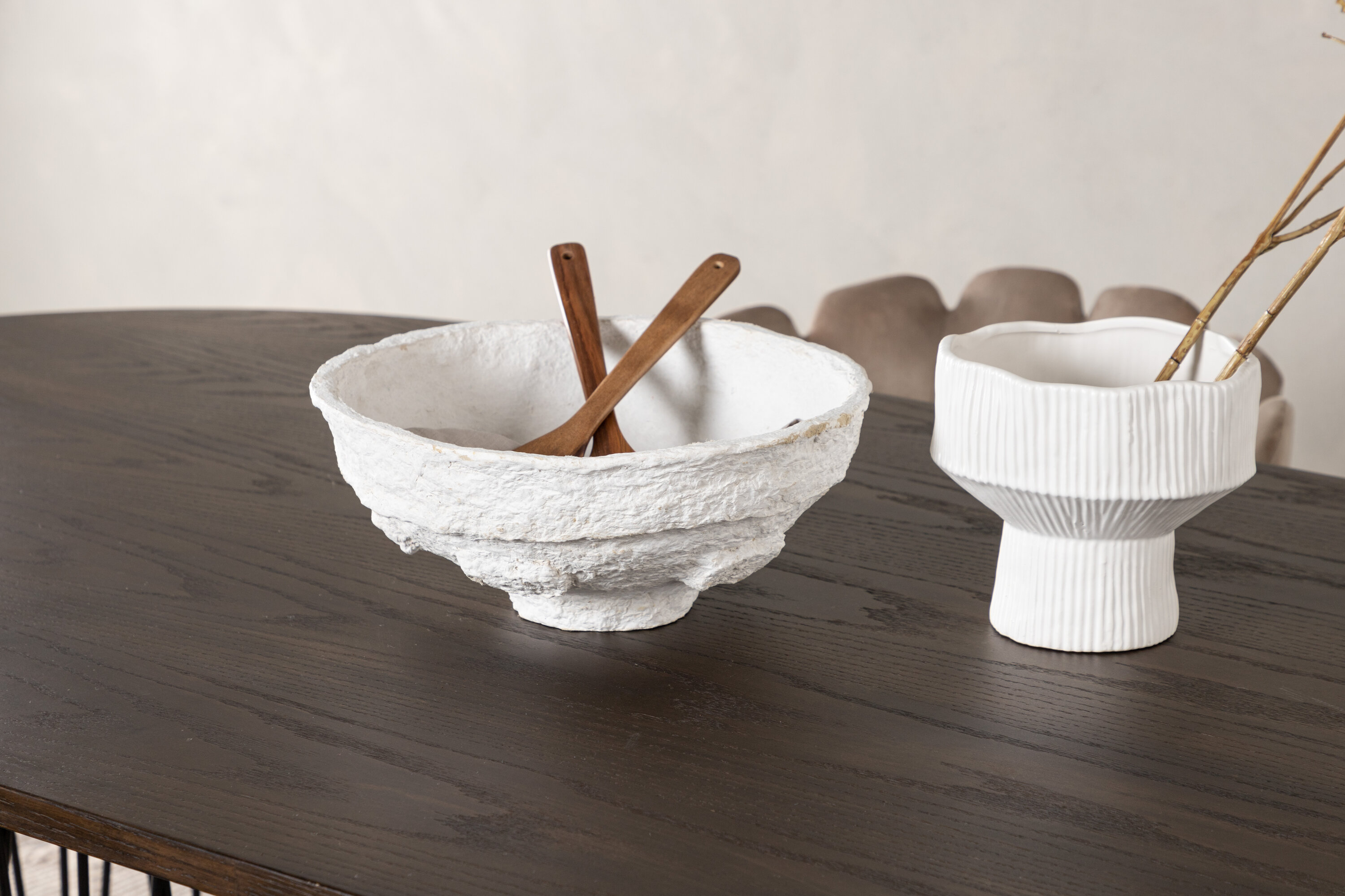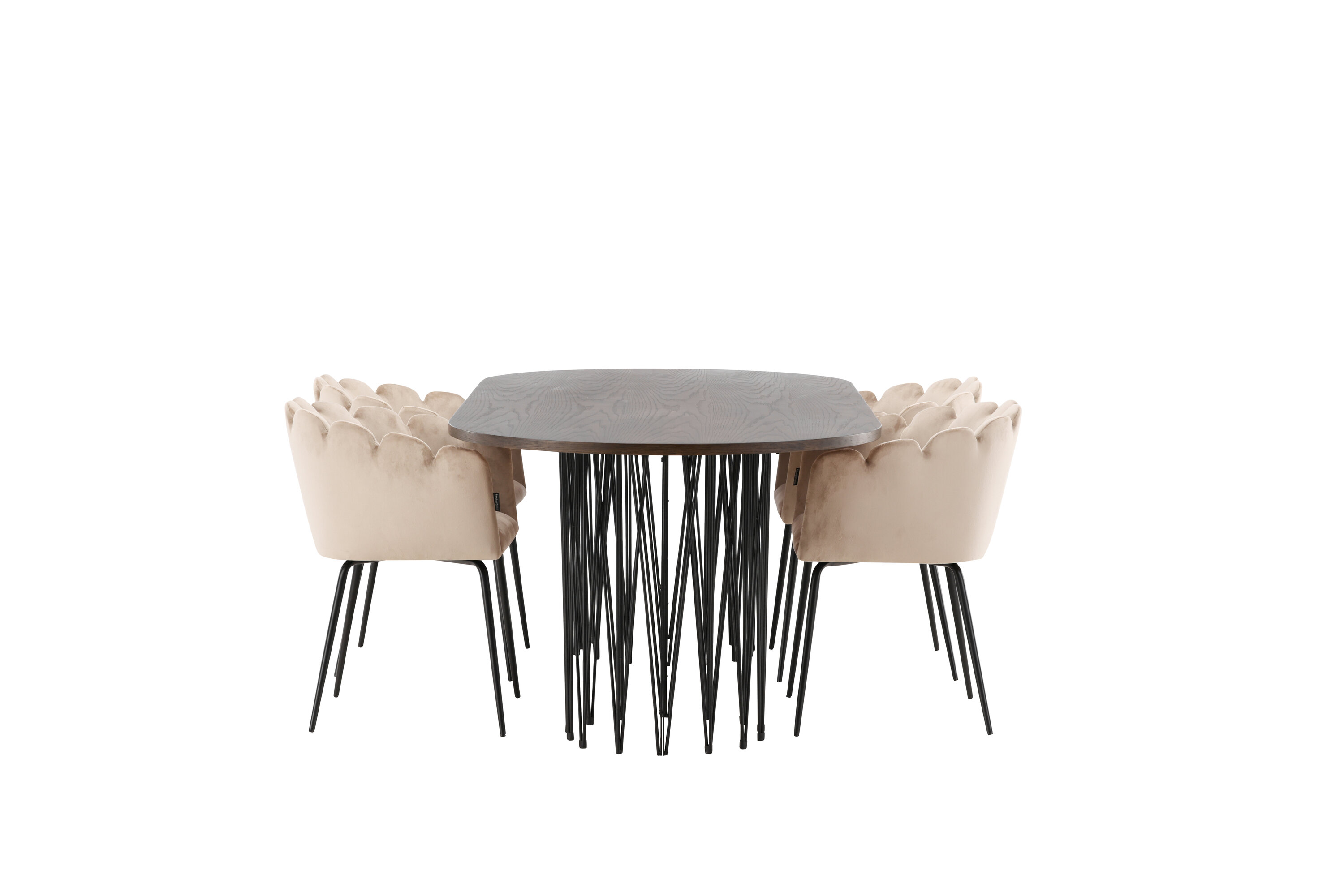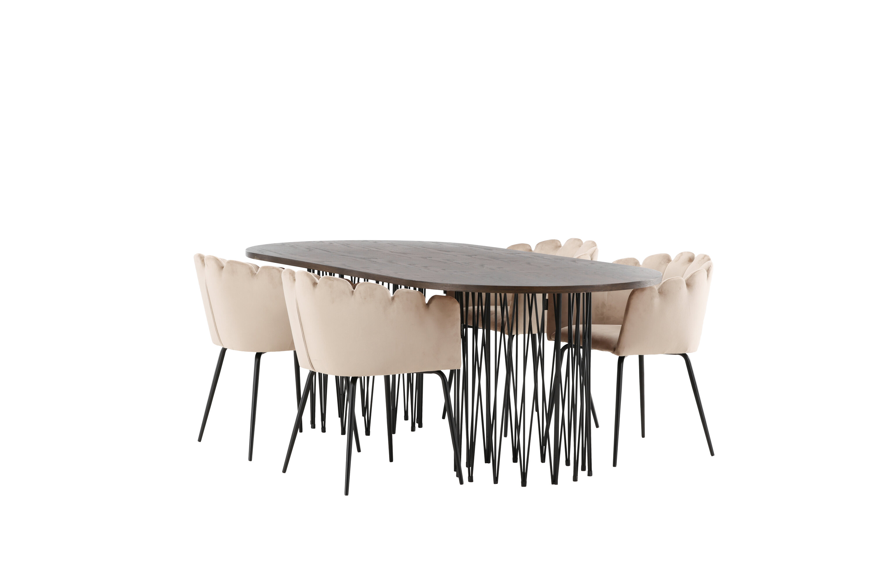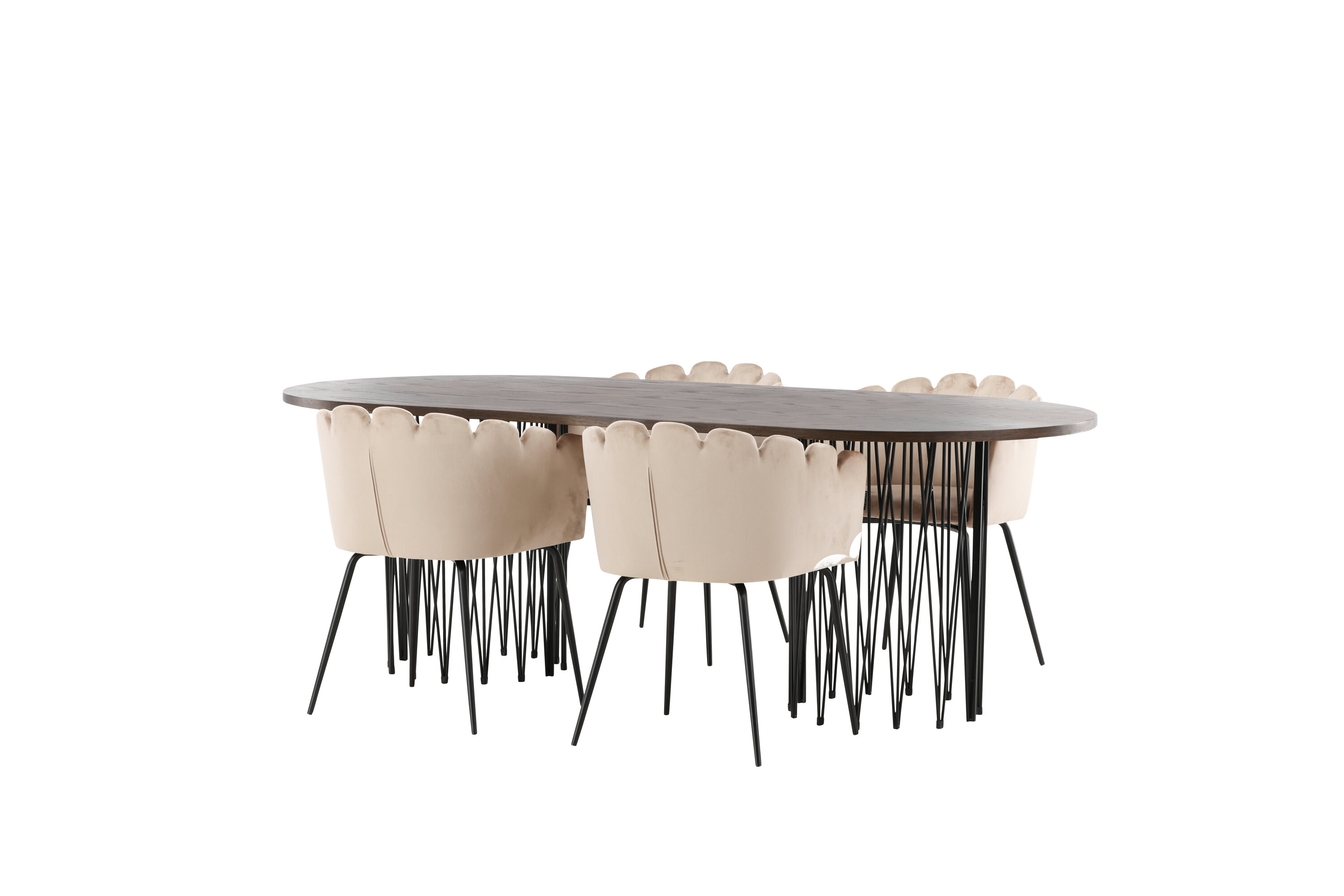 Richt het hart van je huis in met een eetgroep die luxe en comfort uitstraalt! Onze ovale eettafel Stone heeft een fantastisch Scandinavisch design dat past bij de menigte. De tafel heeft een prachtig bruin gekleurd tafelblad in MDF met fineer en twee decoratieve cilindervormige lijsten in zwart metaal. Hier in perfecte combinatie met onze heerlijke stoelen uit de Limhamn serie. De stoel is een moderne favoriet in veel huishoudens met zijn uitnodigende ontwerp, decoratieve schelpvormige rug met decoratieve stiksels en een ronde zitting in smaakvolle beige fluwelen stof. De poten zijn van zwart gepoedercoat metaal. Zit comfortabel en groots!
