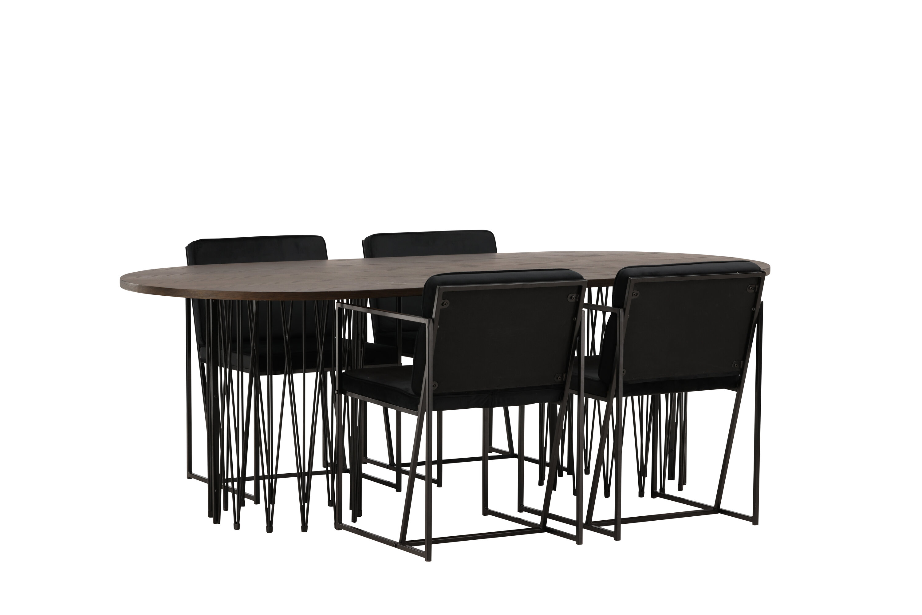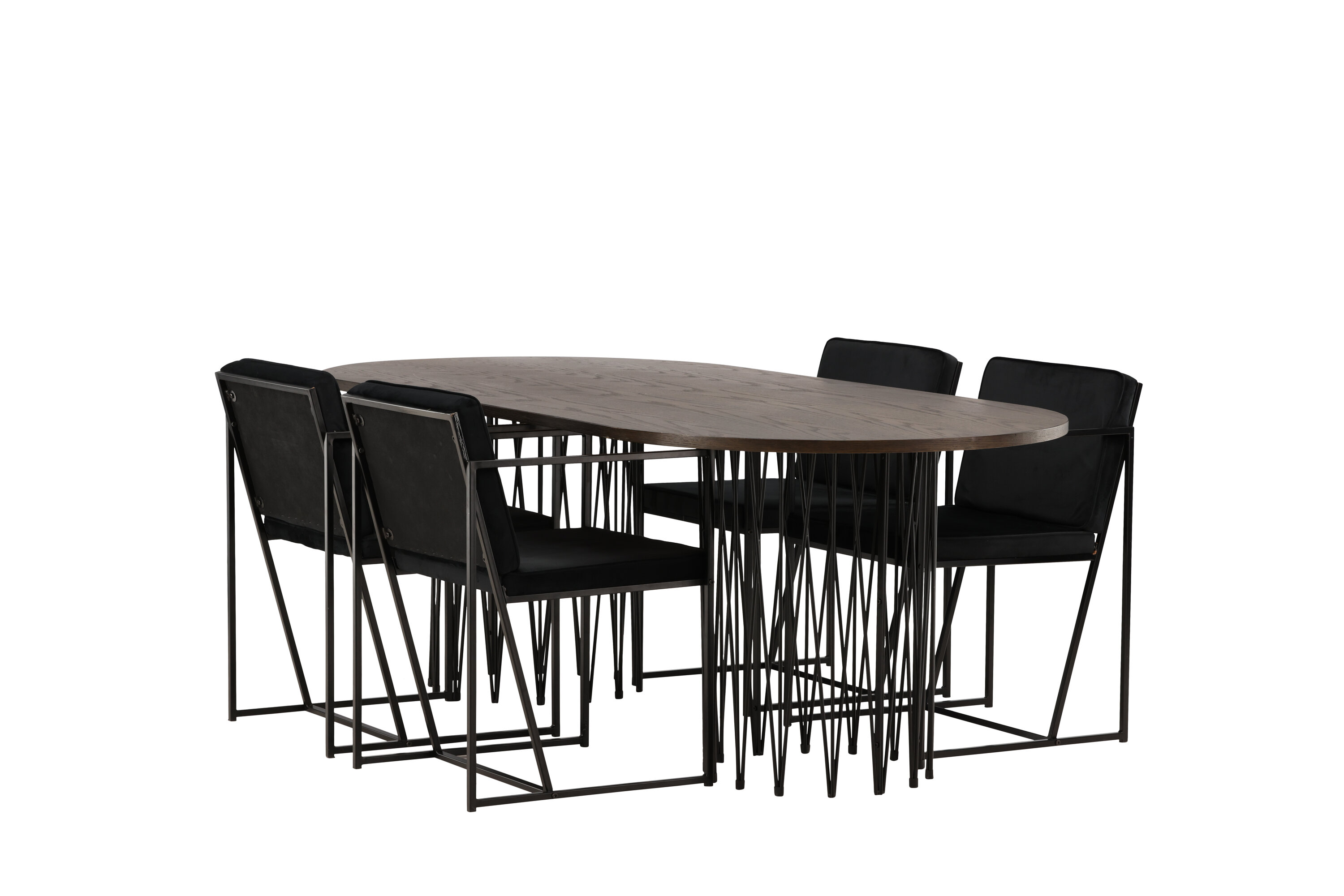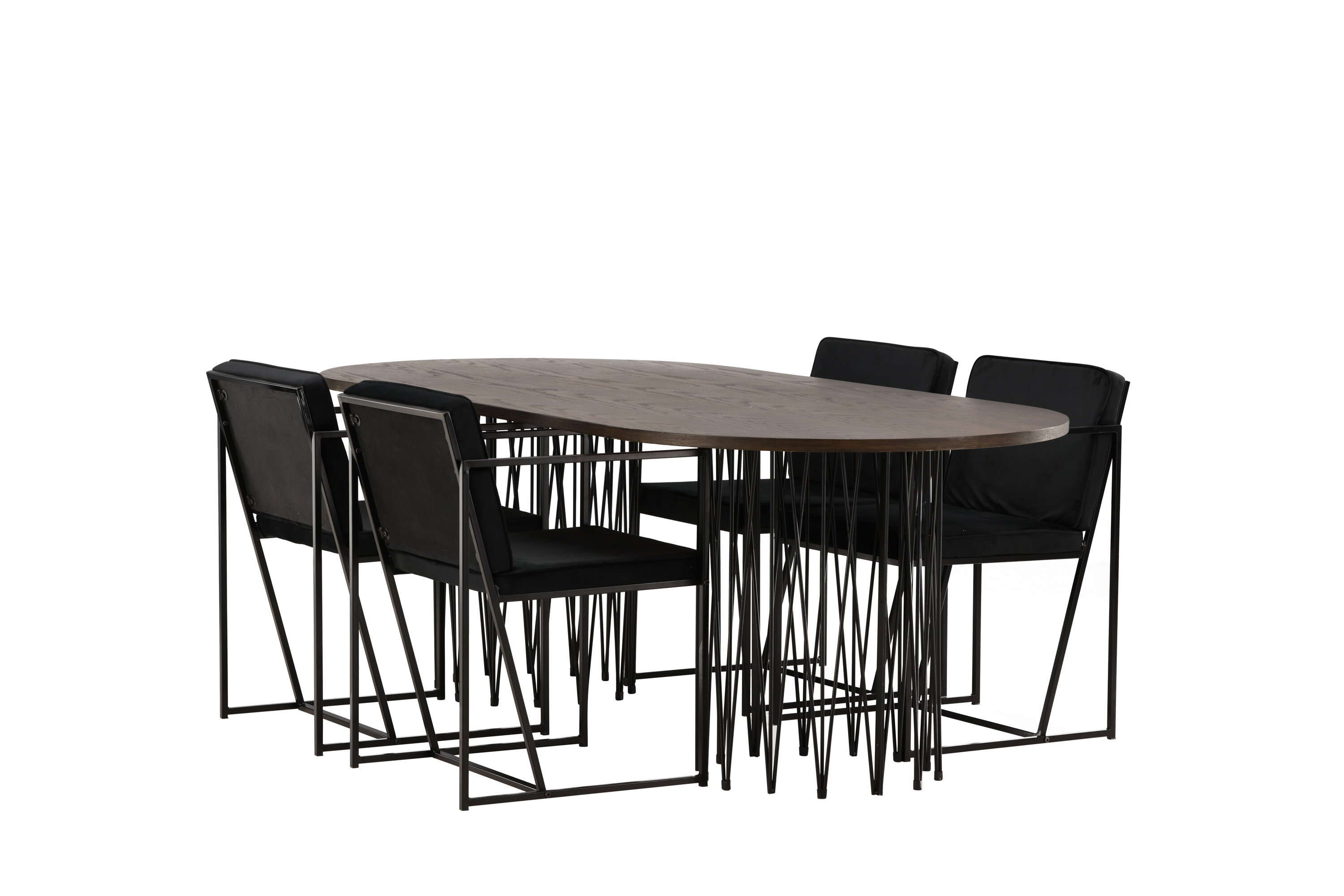 Een eetgroep die indruk maakt op je gasten - luxueus, comfortabel en stijlvol! Onze ovale eettafel Stone heeft een fantastisch, Scandinavisch design! De tafel heeft een mooi bruin gekleurd tafelblad in MDF met fineer en twee decoratieve cilindervormige poten in zwart metaal. Hier in een prachtige combinatie met onze heerlijke stoelen uit de Richmond serie. De stoel heeft een minimalistisch frame in zwart staal en een volledig gestoffeerde zitting in zwart fluwelen stof. Leun achterover en zit comfortabel!