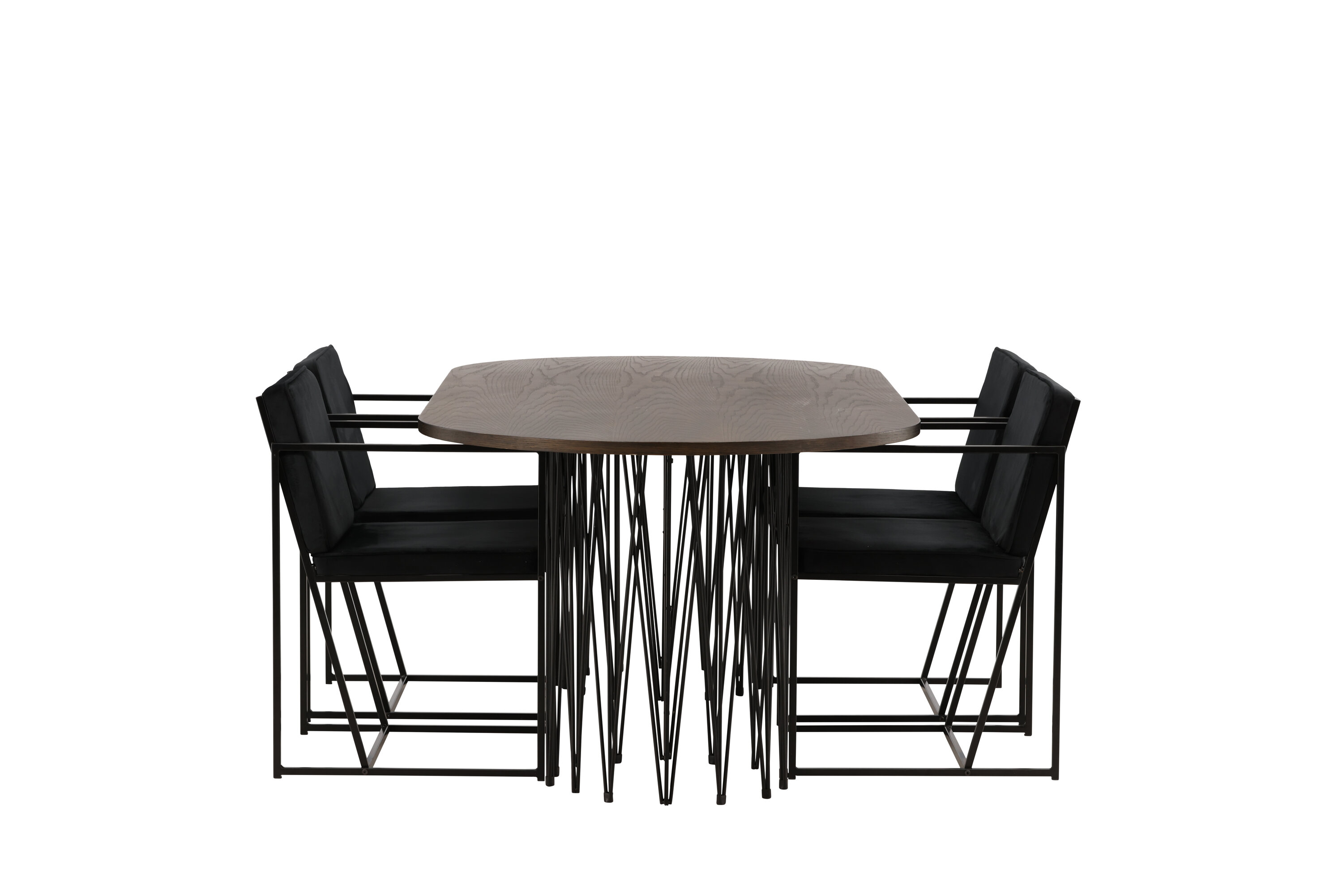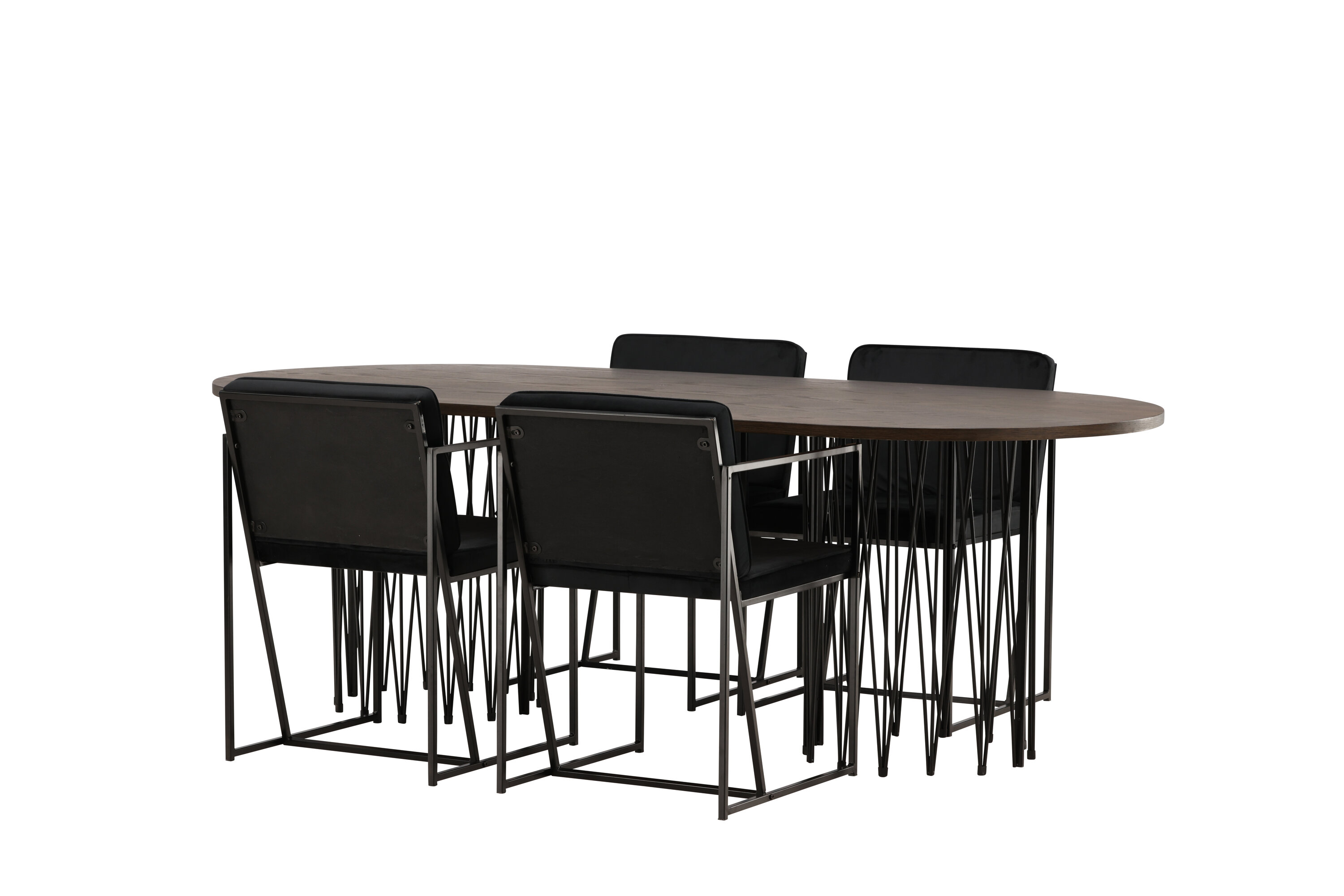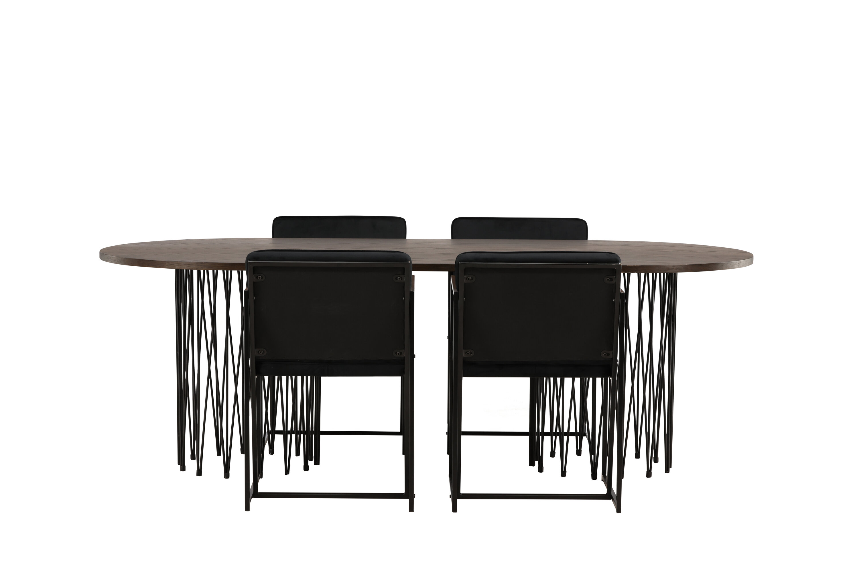 Een eetgroep die indruk maakt op je gasten - luxueus, comfortabel en stijlvol! Onze ovale eettafel Stone heeft een fantastisch, Scandinavisch design! De tafel heeft een mooi bruin gekleurd tafelblad in MDF met fineer en twee decoratieve cilindervormige poten in zwart metaal. Hier in een prachtige combinatie met onze heerlijke stoelen uit de Richmond serie. De stoel heeft een minimalistisch frame in zwart staal en een volledig gestoffeerde zitting in zwart fluwelen stof. Leun achterover en zit comfortabel!