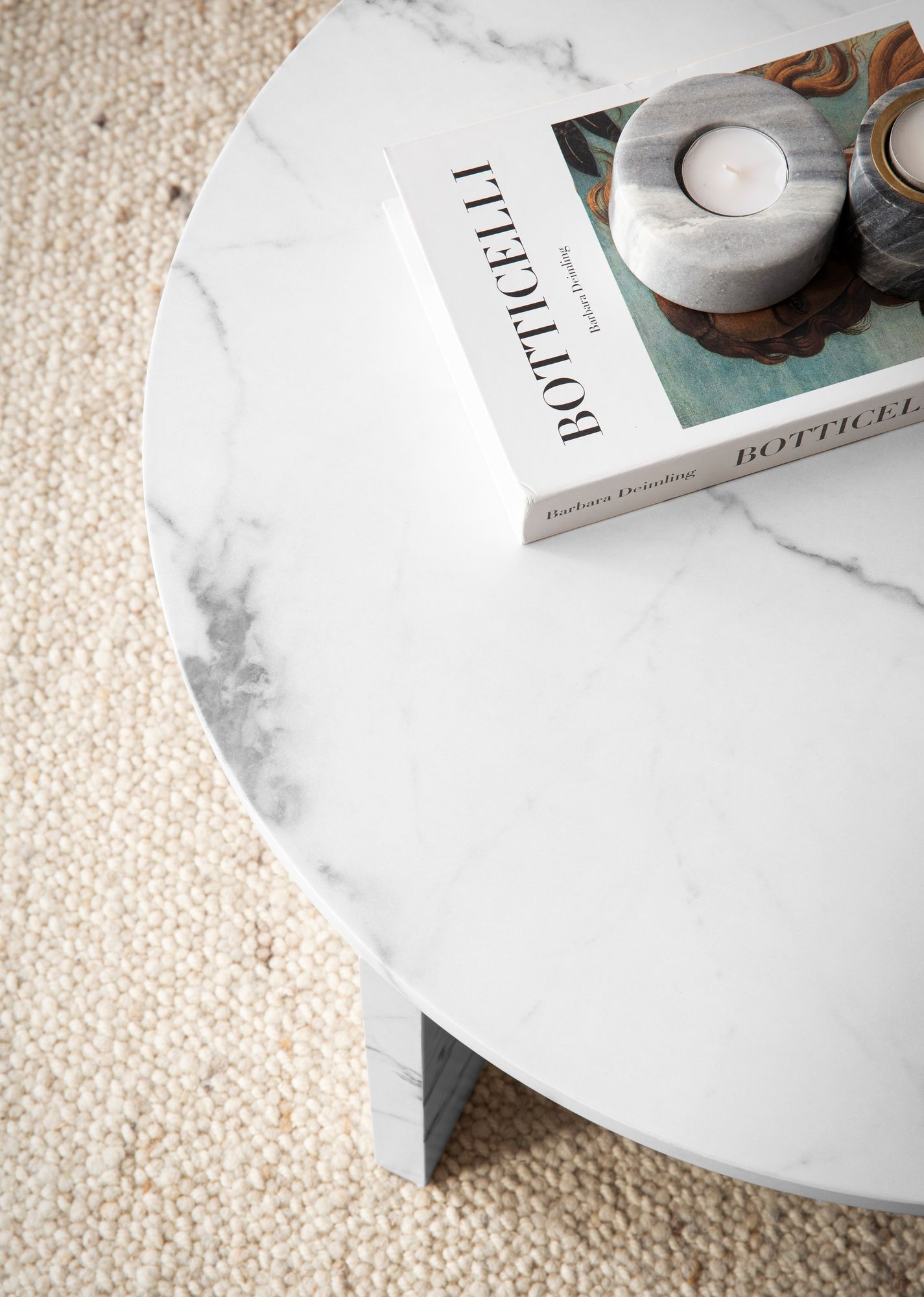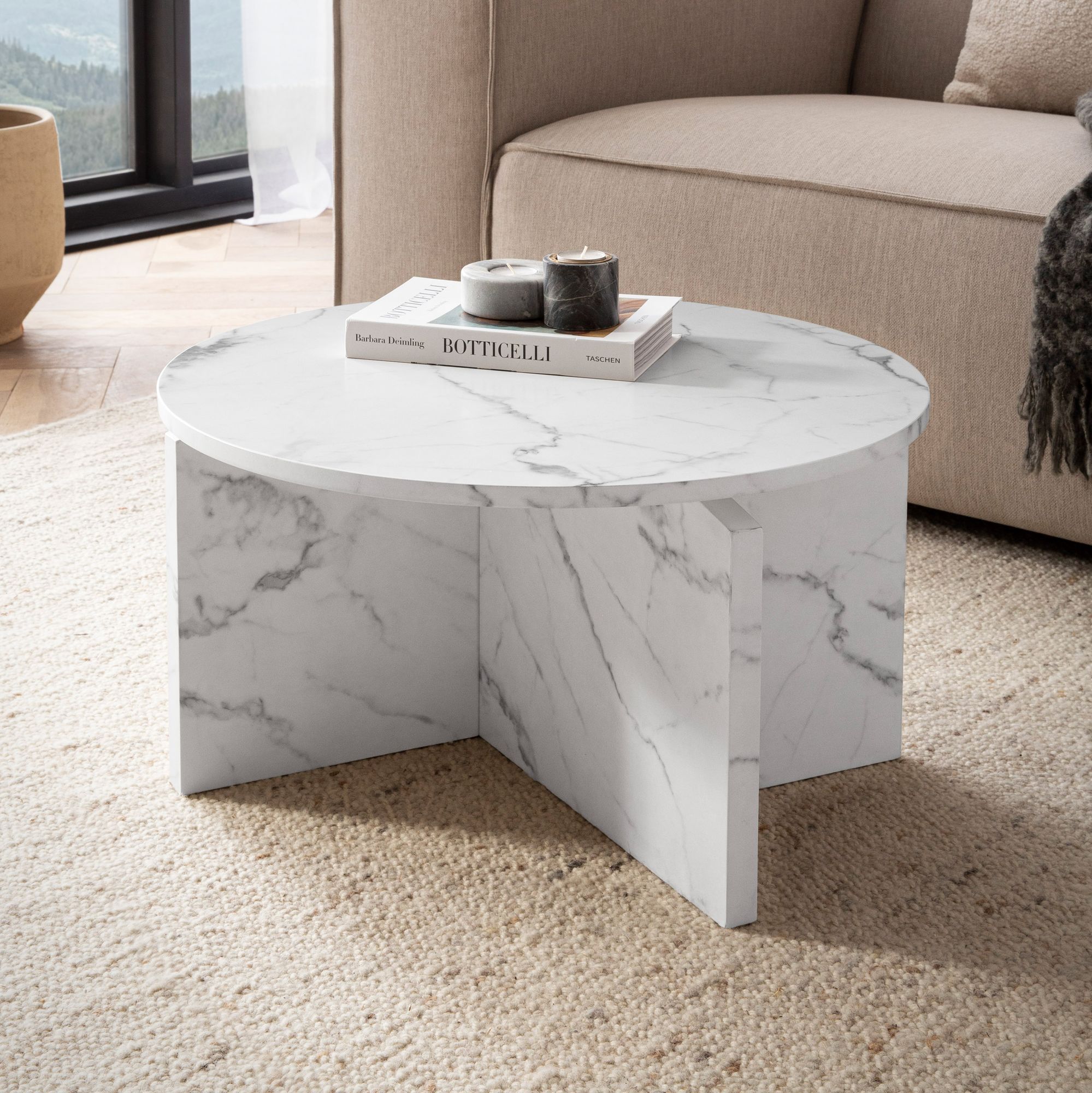 Breng met deze ronde witte MDF salontafel met matte marmerlook een heldere en elegante sfeer in uw woonkamer. Het slanke, moderne design past naadloos in verschillende ruimtes.