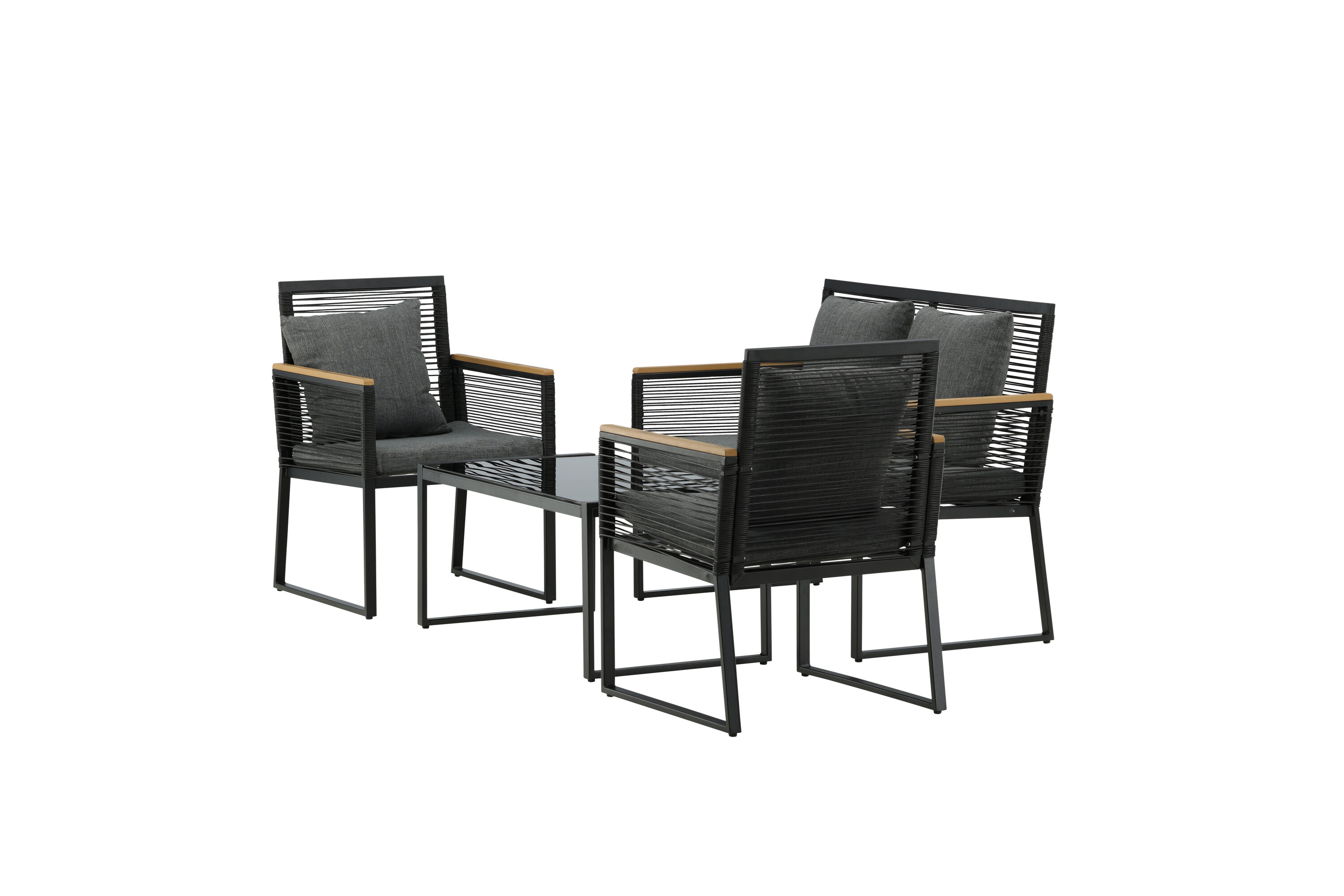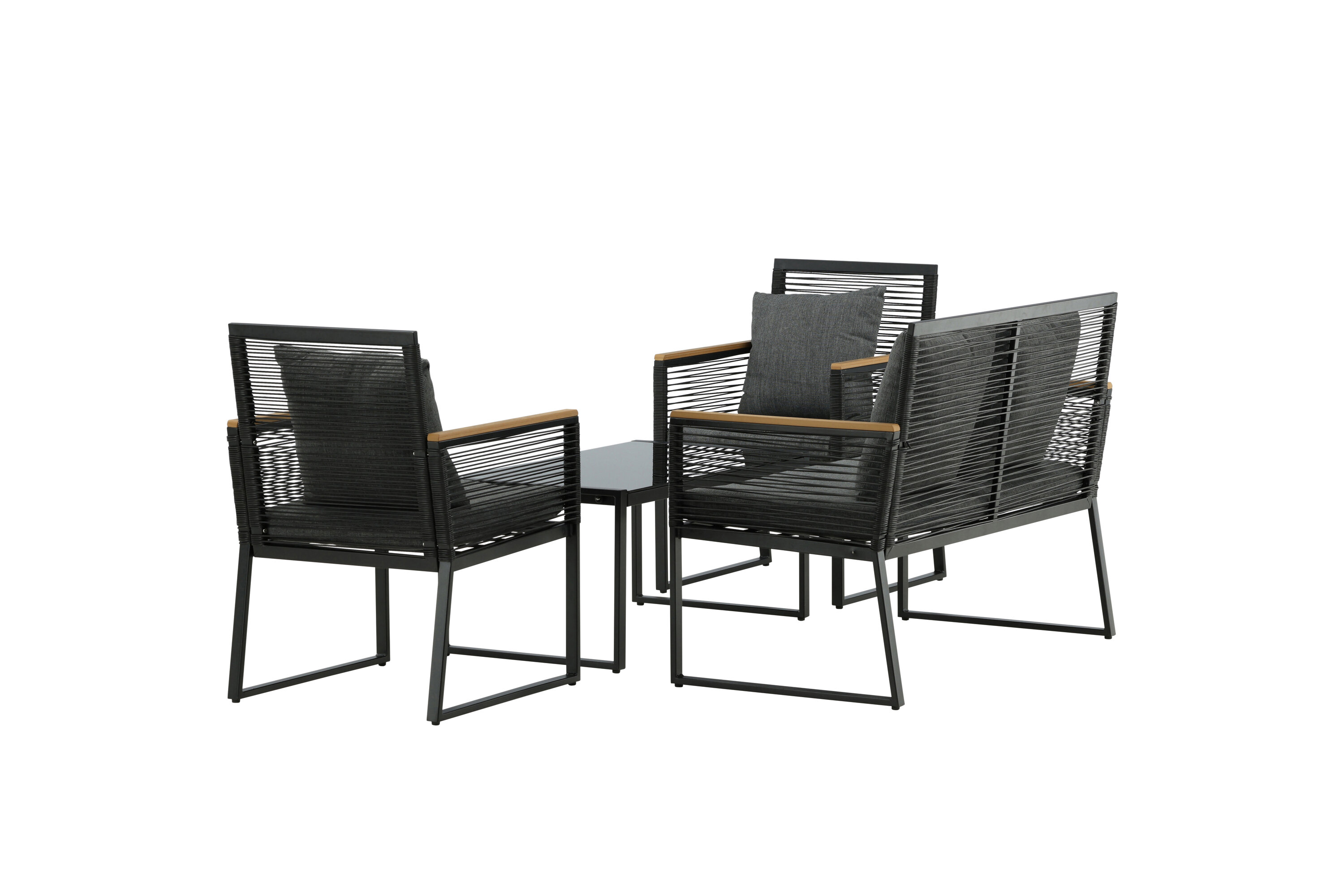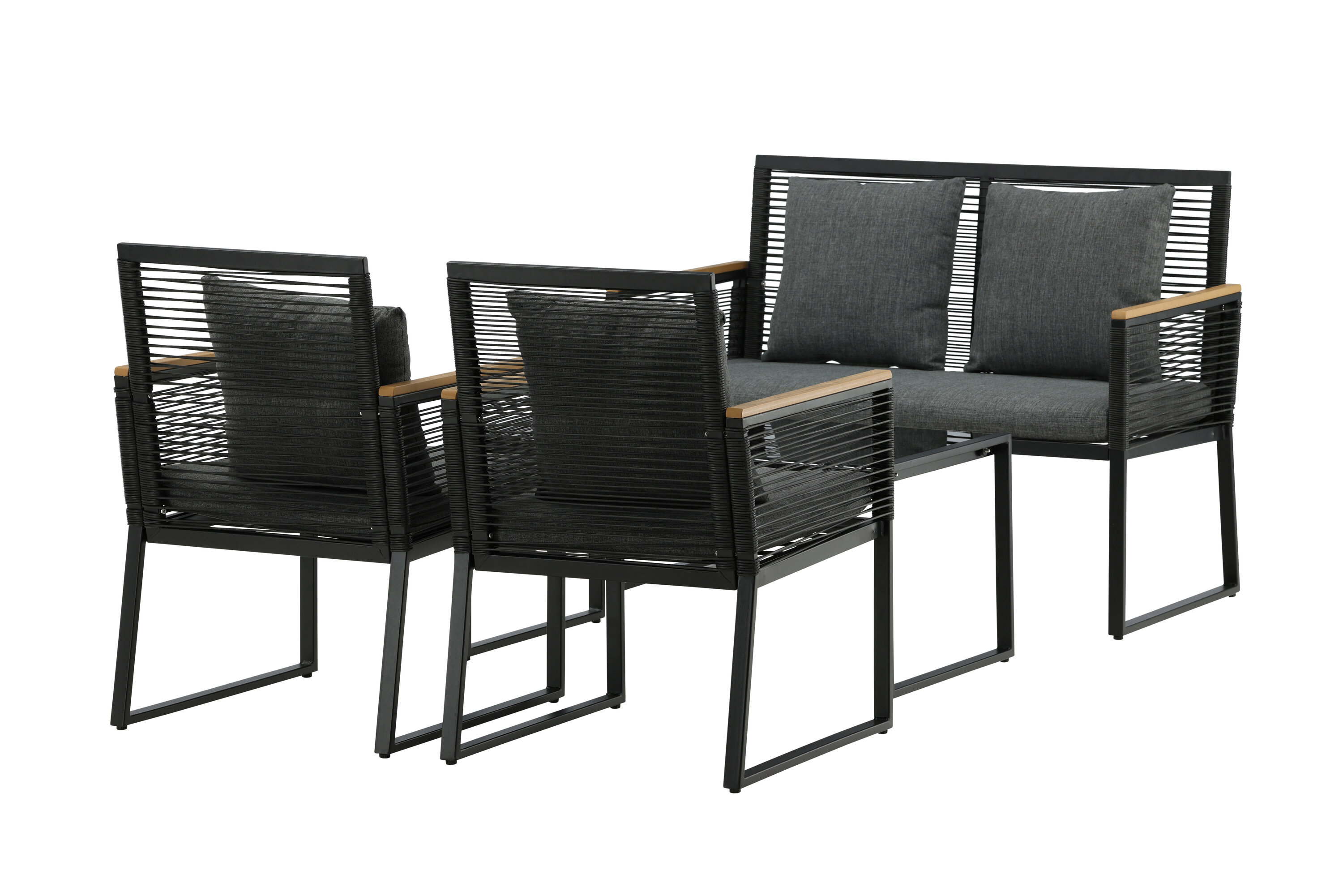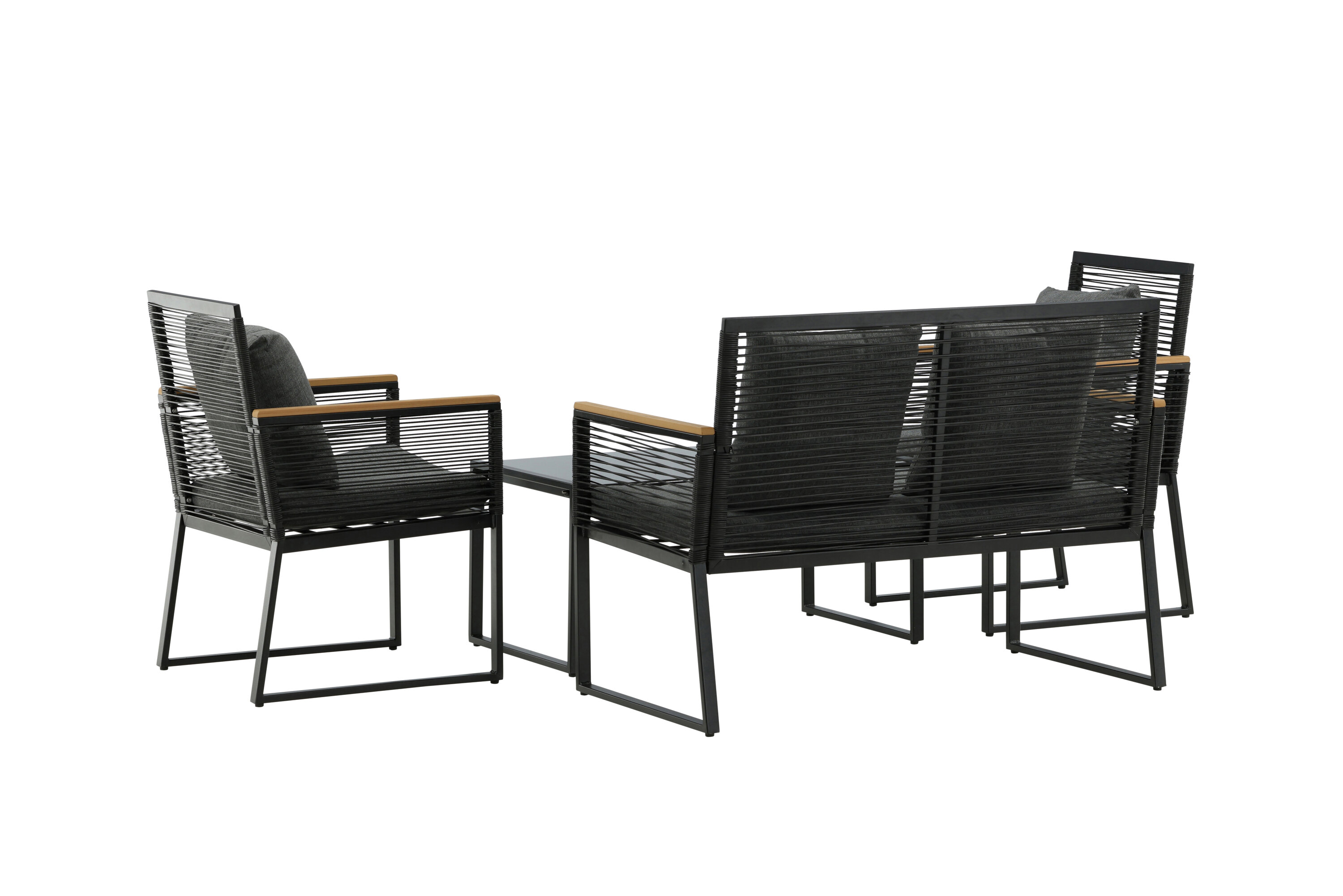 Welkom thuis bij een ontspannende en in het oog springende bankgroep in trendy design! Dalla's bankgroep is een mooie en stijlvolle groep in zwart aluminium met bijbehorende tafel met een glazen bovenplaat. Duurzame kussens in grijs zijn inbegrepen en de groep biedt plaats aan in totaal 4 zittende gasten. Tafelafmetingen: 90x50x42,5 cm. Afmeting bank: 60x84 cm. Afmetingen Sita: 49/105x51x37 cm.