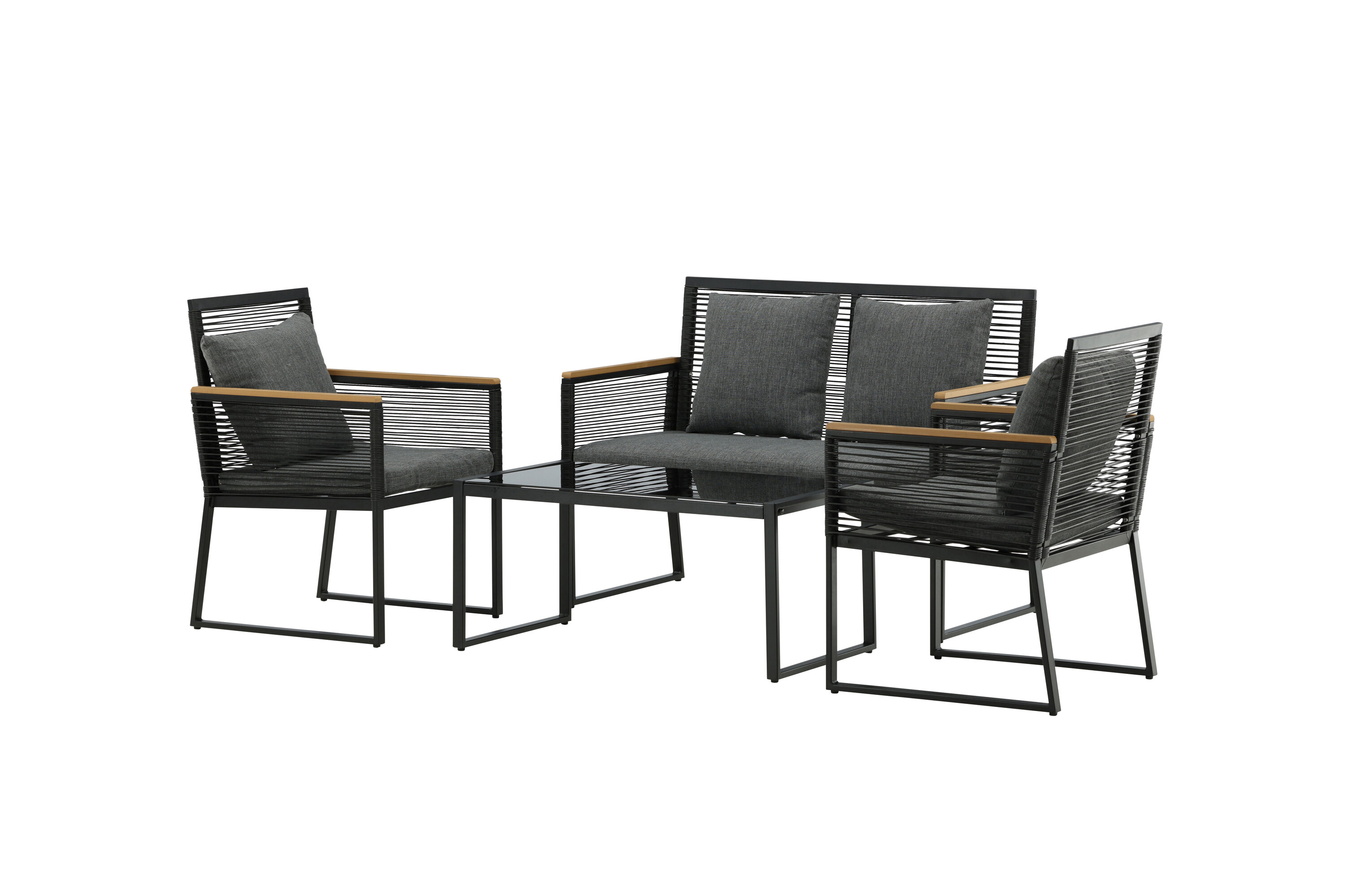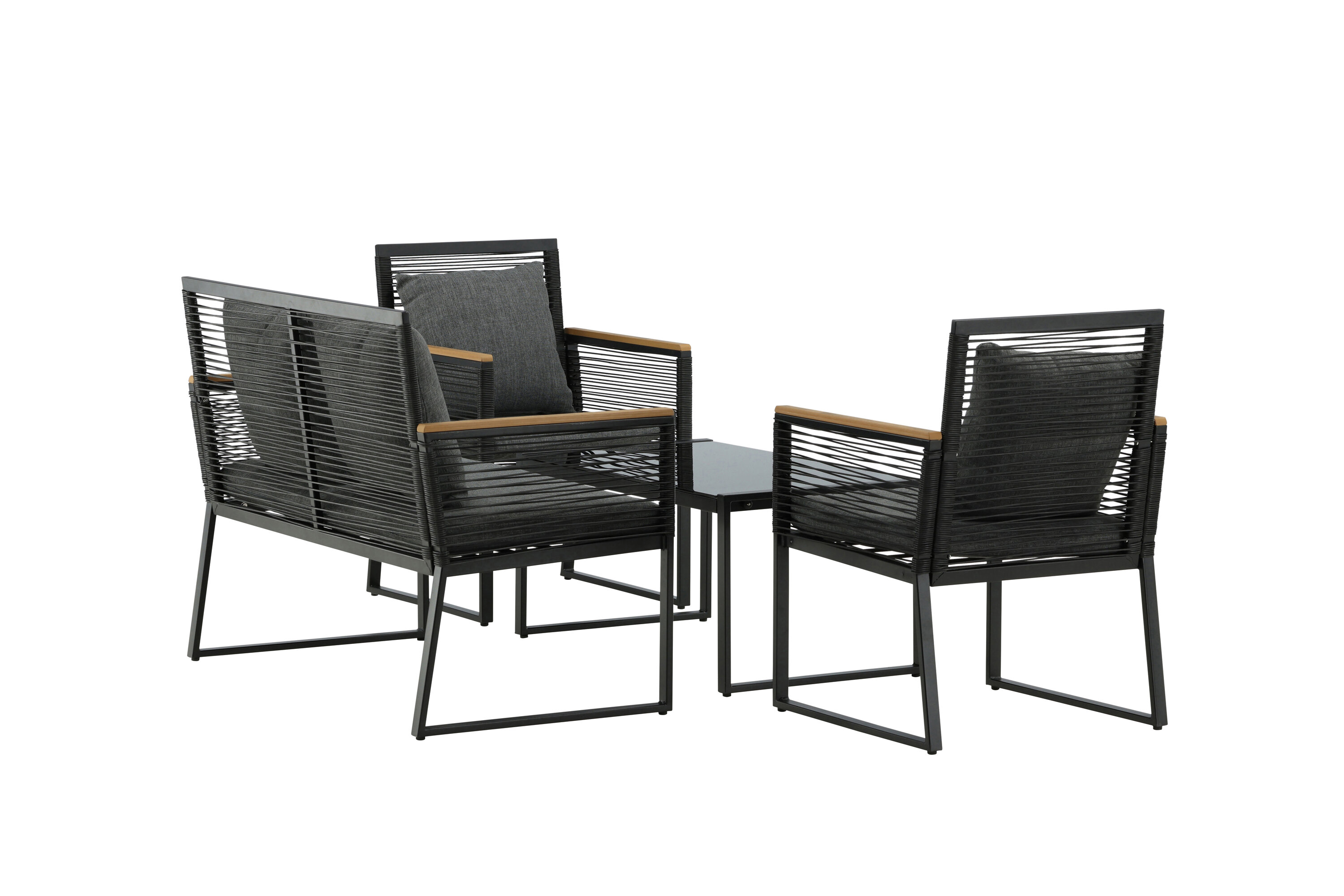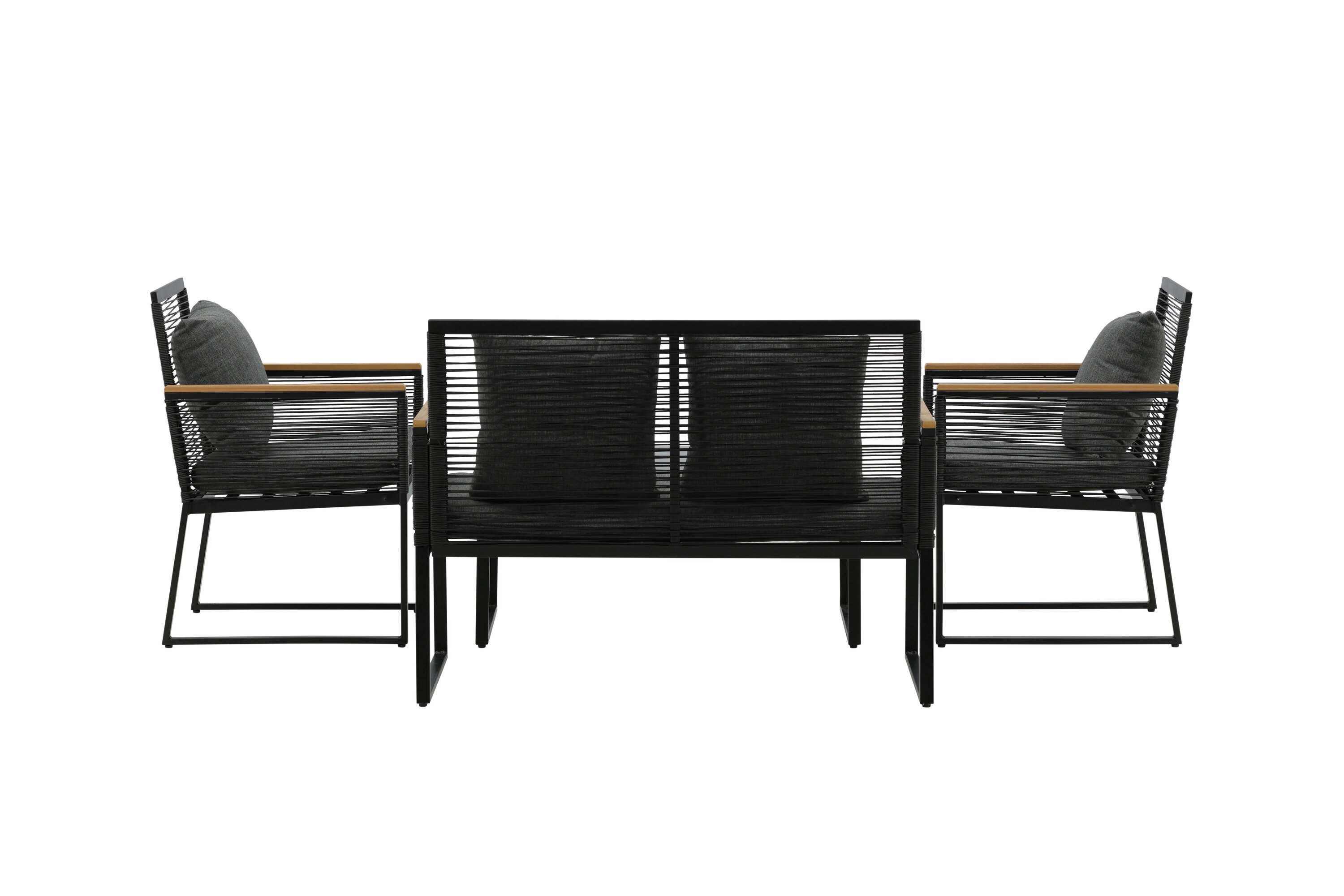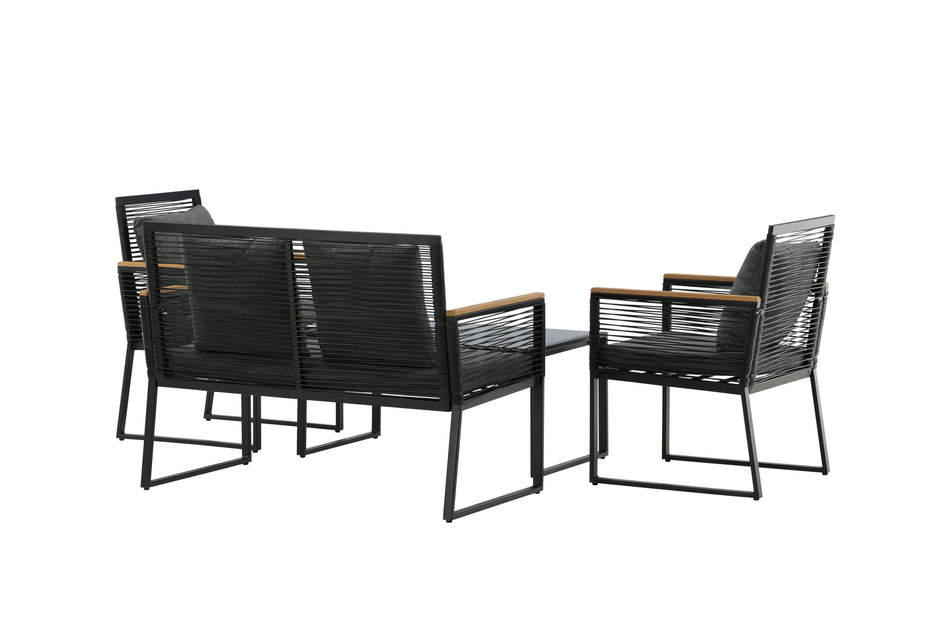 Welkom thuis bij een ontspannende en in het oog springende bankgroep in trendy design! Dalla's bankgroep is een mooie en stijlvolle groep in zwart aluminium met bijbehorende tafel met een glazen bovenplaat. Duurzame kussens in grijs zijn inbegrepen en de groep biedt plaats aan in totaal 4 zittende gasten. Tafelafmetingen: 90x50x42,5 cm. Afmeting bank: 60x84 cm. Afmetingen Sita: 49/105x51x37 cm.