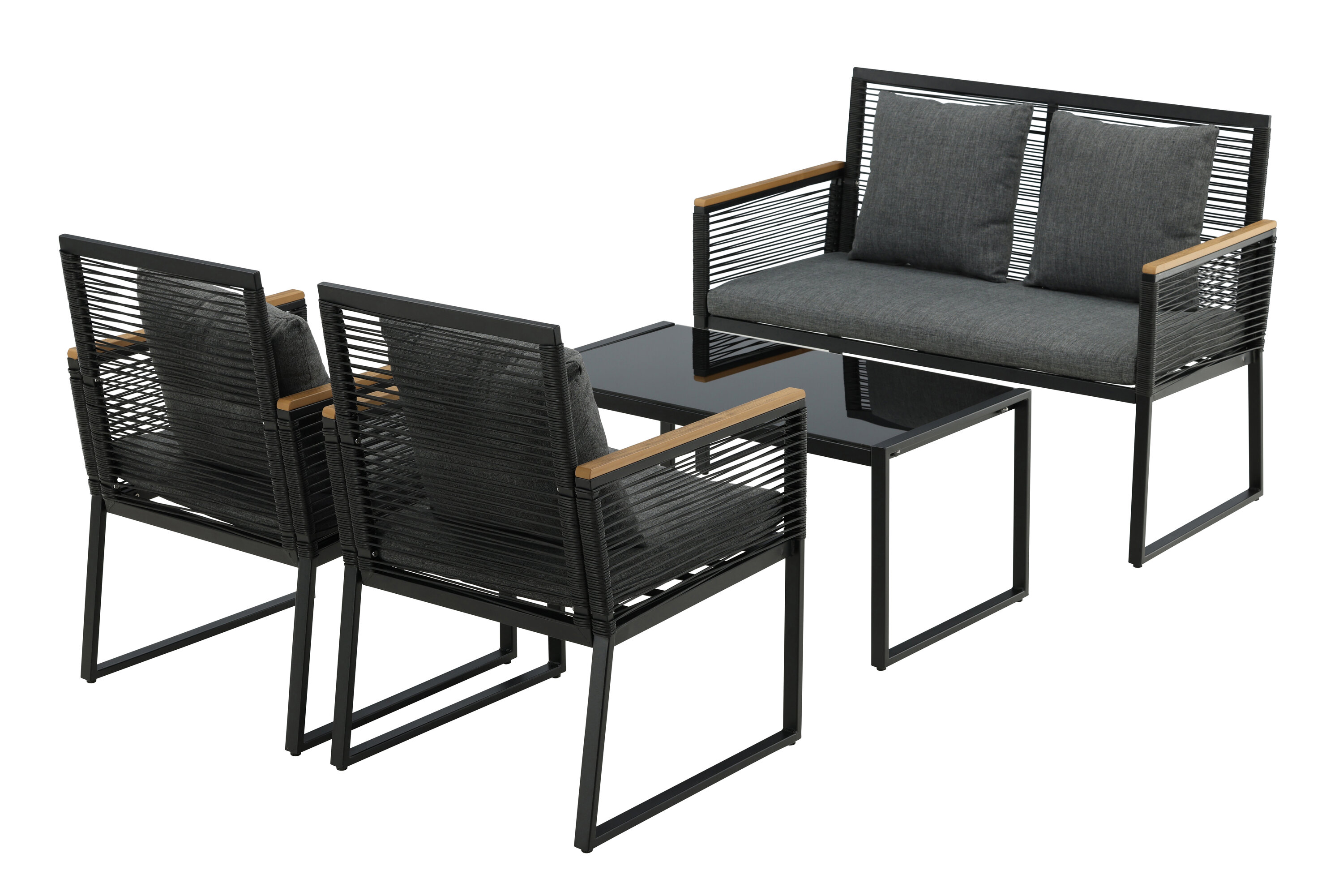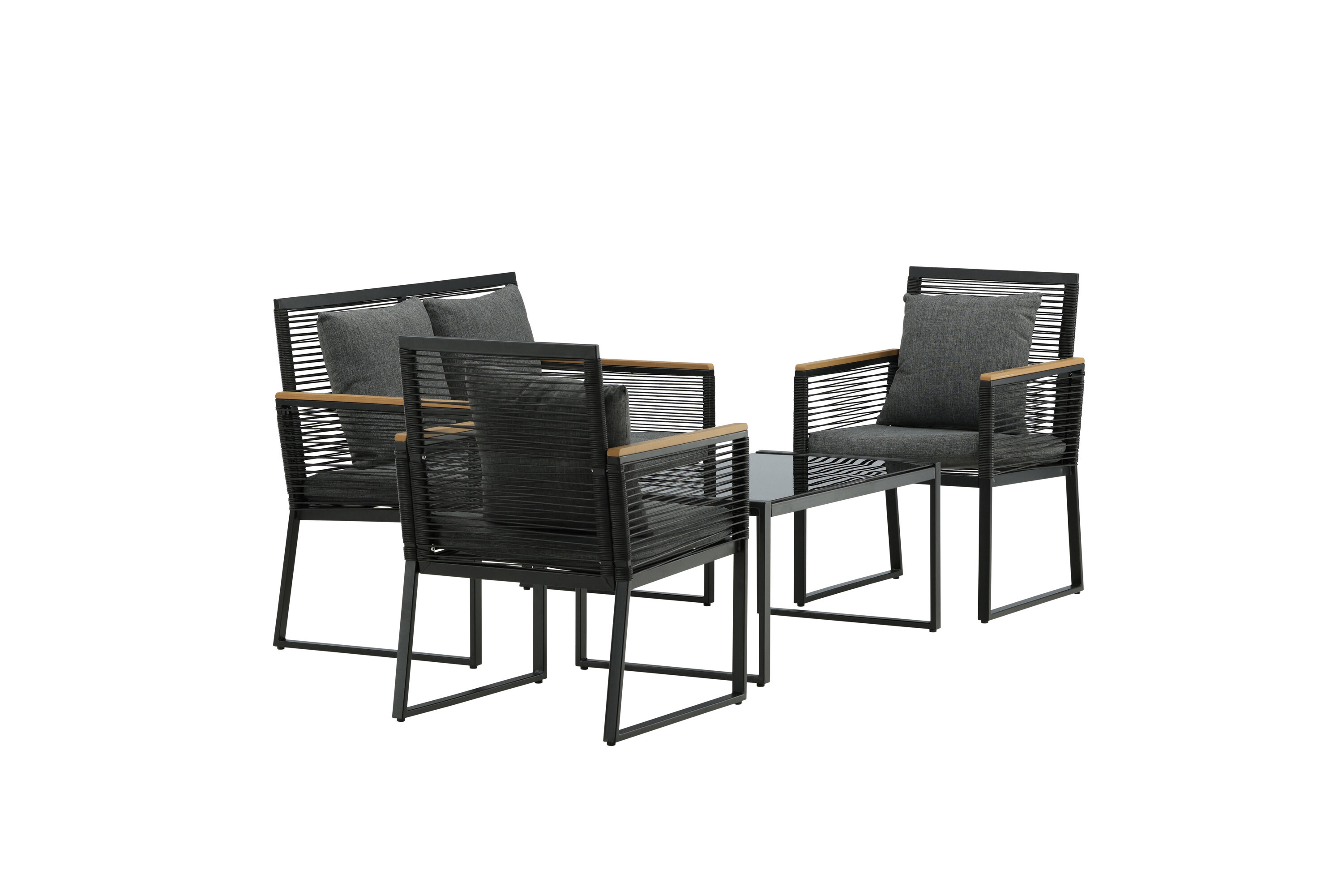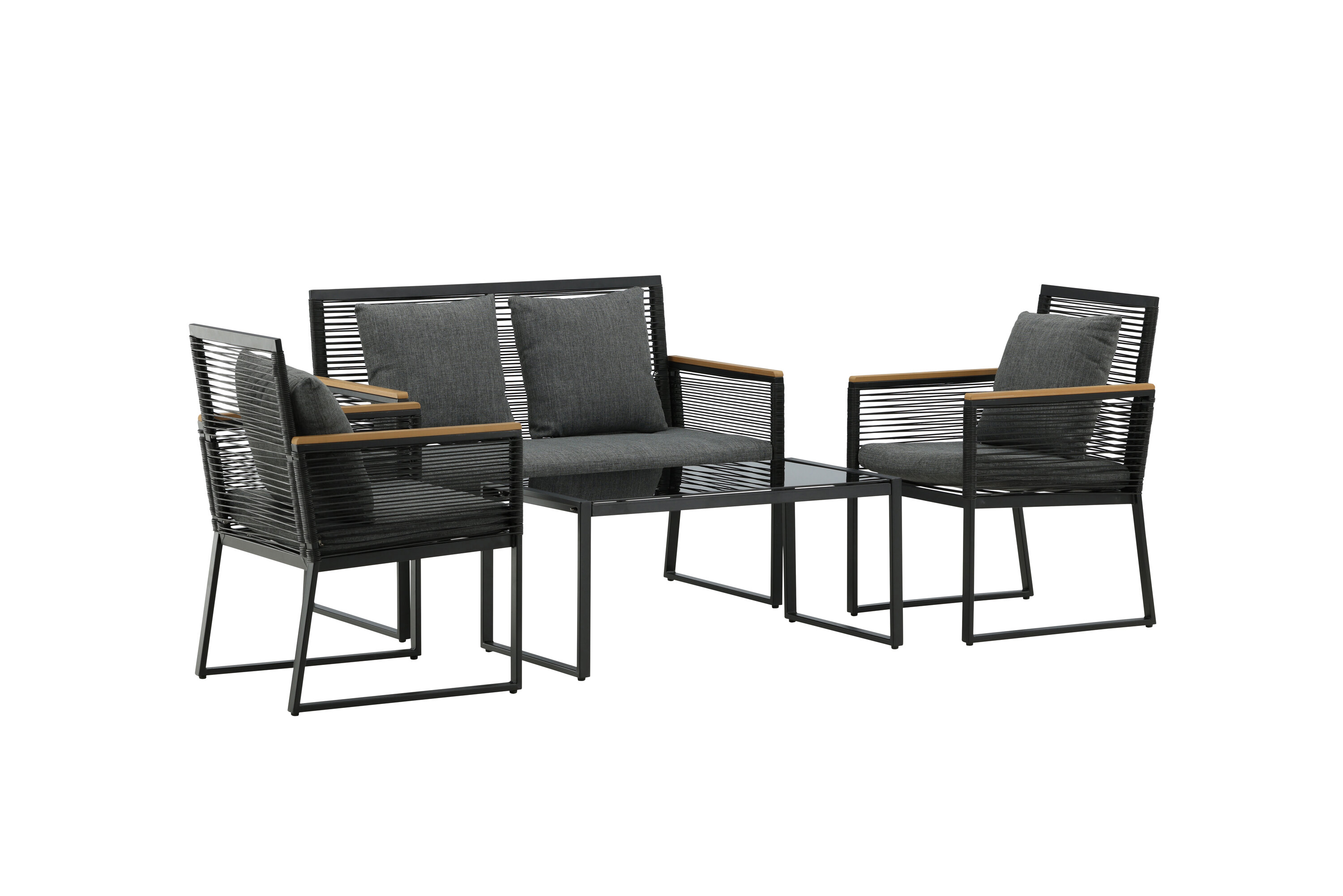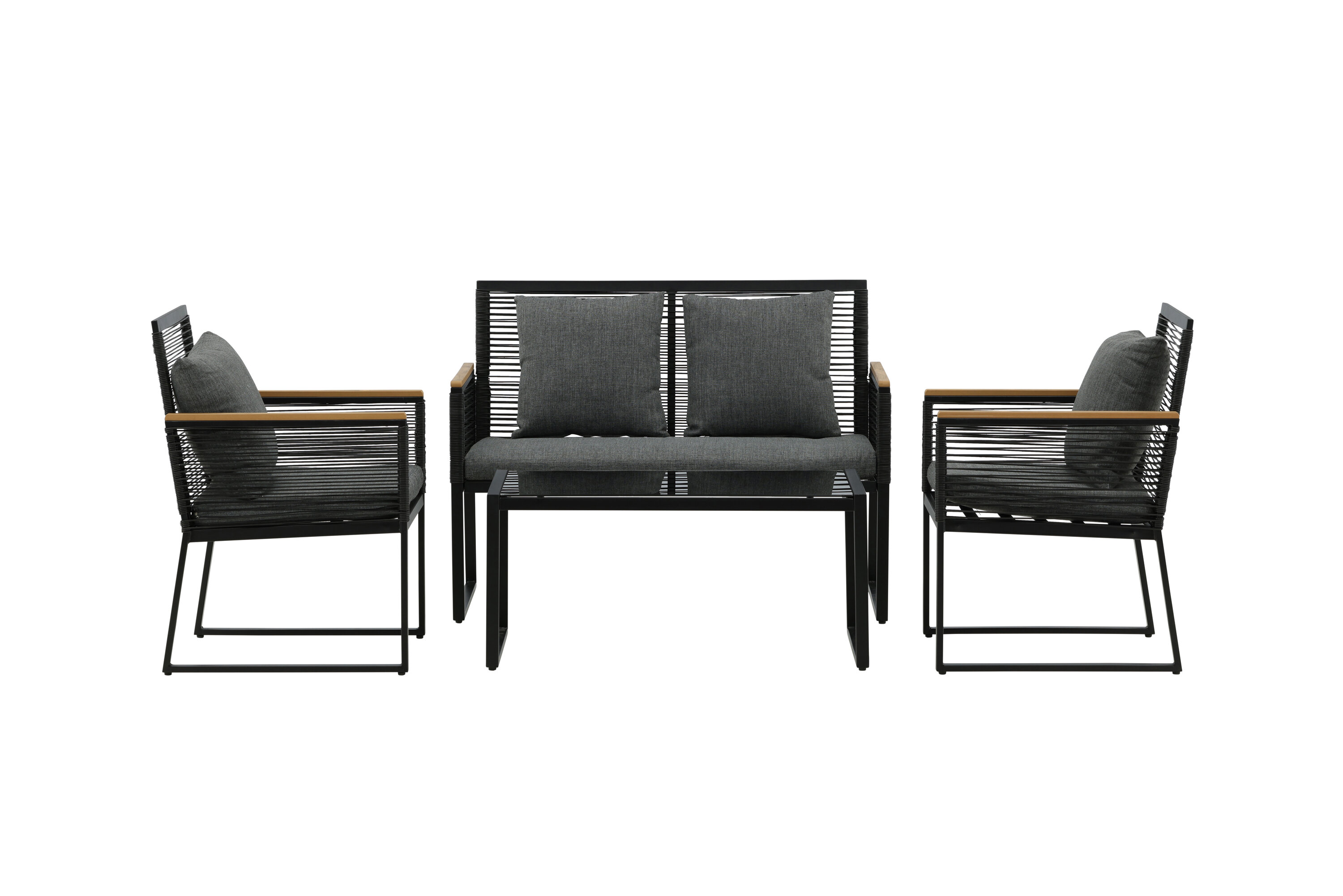 Welkom thuis bij een ontspannende en in het oog springende bankgroep in trendy design! Dalla's bankgroep is een mooie en stijlvolle groep in zwart aluminium met bijbehorende tafel met een glazen bovenplaat. Duurzame kussens in grijs zijn inbegrepen en de groep biedt plaats aan in totaal 4 zittende gasten. Tafelafmetingen: 90x50x42,5 cm. Afmeting bank: 60x84 cm. Afmetingen Sita: 49/105x51x37 cm.