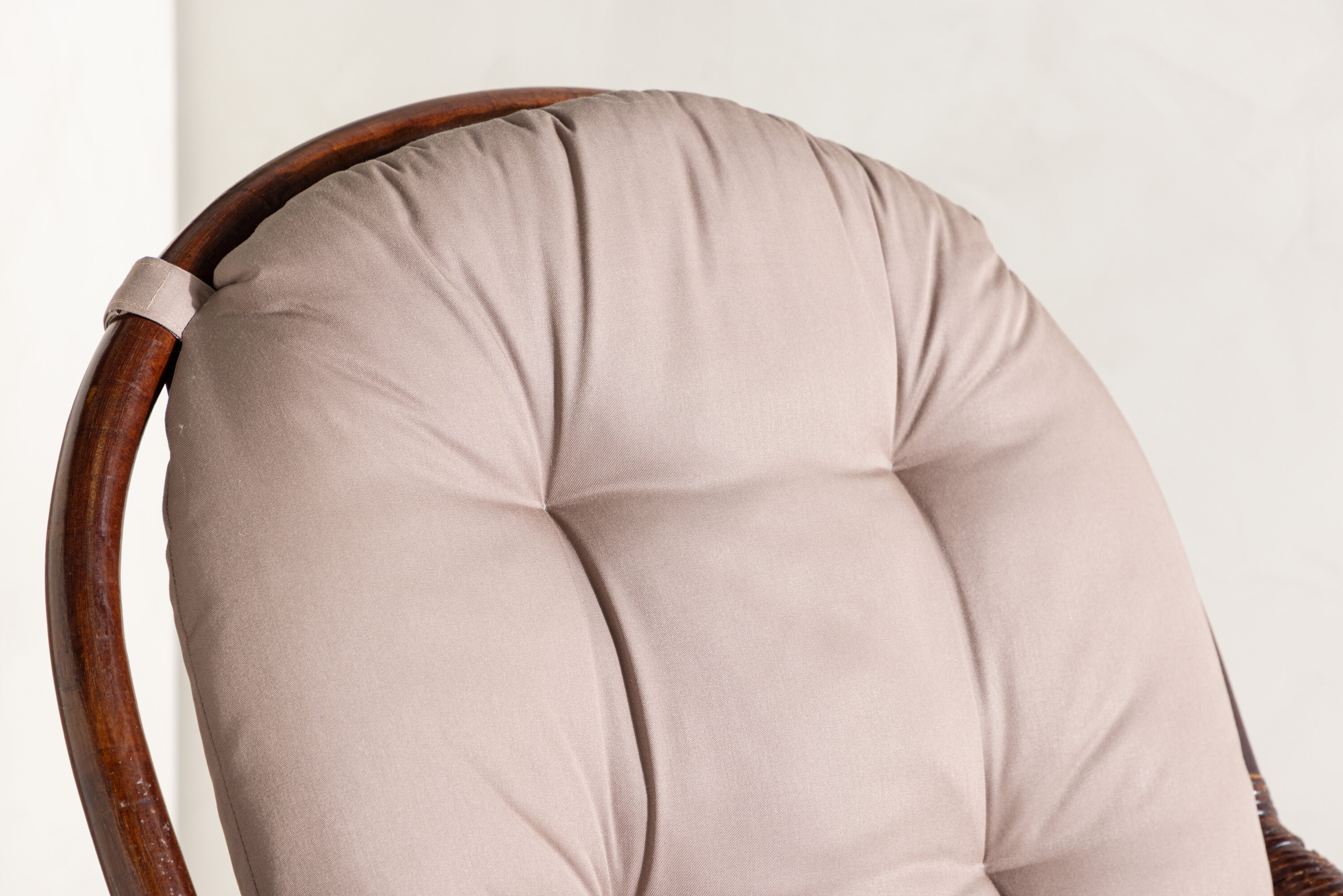 Breng elegantie en comfort in je buitenruimte met de Swing loungestoel, gemaakt van prachtig rattan. De diepe donkere walnootkleur zorgt voor een verfijnde en warme sfeer, terwijl het meegeleverde beige kussen extra zachtheid en stijl toevoegt aan de zitervaring.