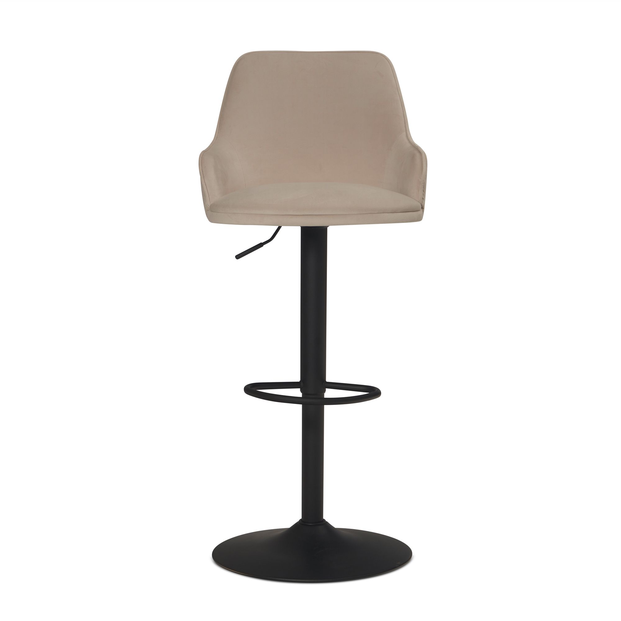 Combineer modern design en comfort met deze beige fluwelen barkruk, verstelbaar in hoogte van 86 tot 106 cm. De ergonomisch gevormde zit met ruitstiksels op armleuningen en rugleuning zorgt voor optimaal zitcomfort. De zwarte metalen trompetvoet biedt stevige en stijlvolle ondersteuning.
